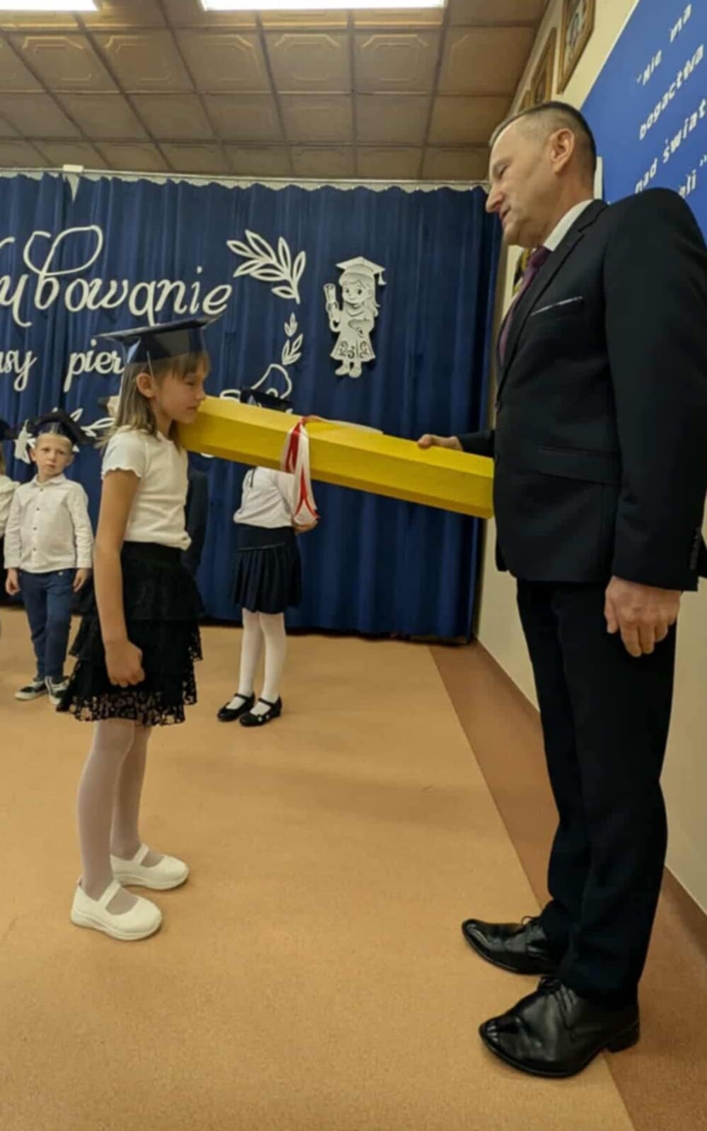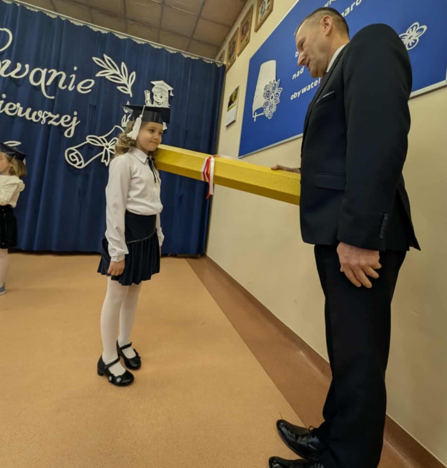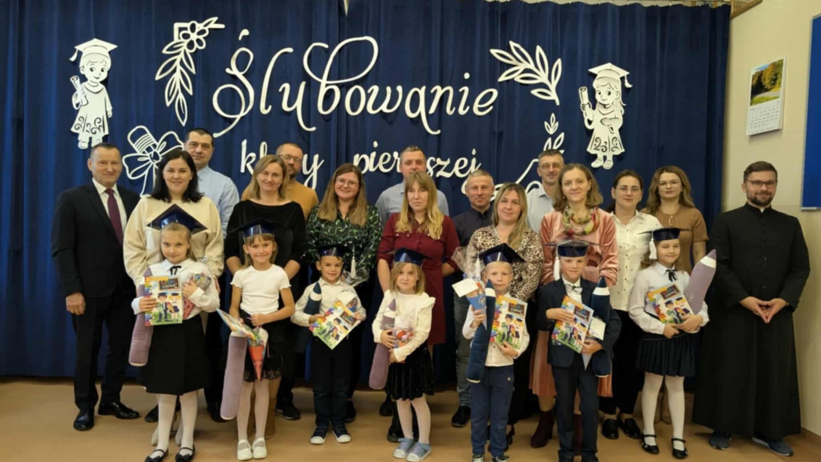 Najważniejszym momentem uroczystości było złożenie ślubowania na sztandar szkoły. Pierwszoklasiści ślubowali być pilnymi i uczciwymi uczniami, szanować nauczycieli, rodziców i kolegów oraz dbać o dobre imię swojej szkoły. Po wypowiedzeniu słów ślubowania pan dyrektor Stanisław Saj, dokonał symbolicznego aktu pasowania na ucznia, dotykając ramienia każdego dziecka dużym ołówkiem – symbolem nauki i mądrości.