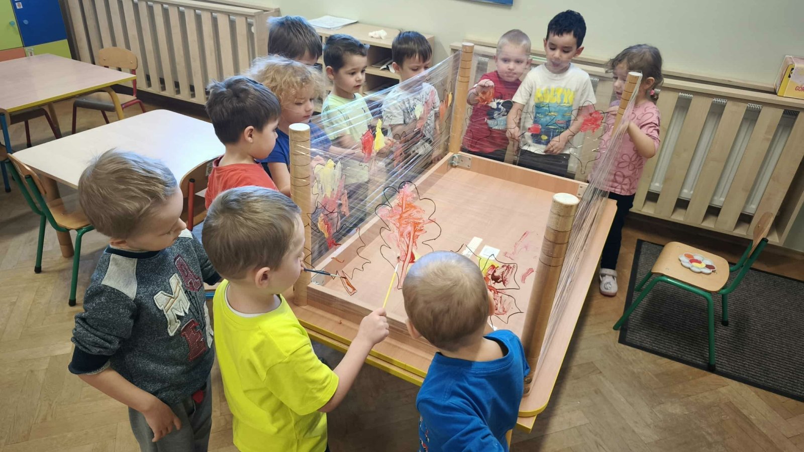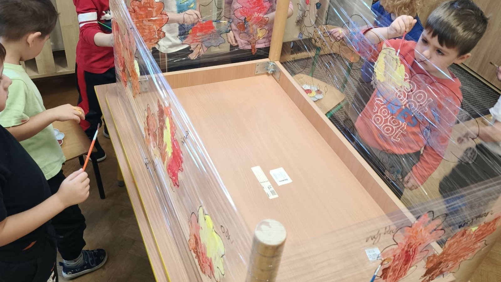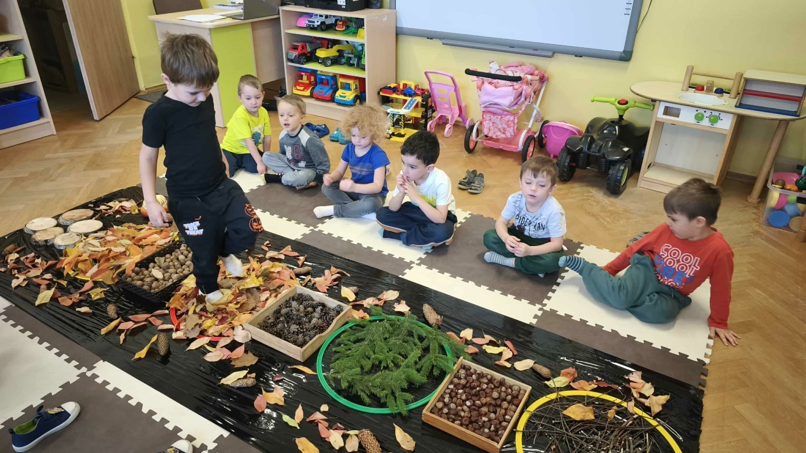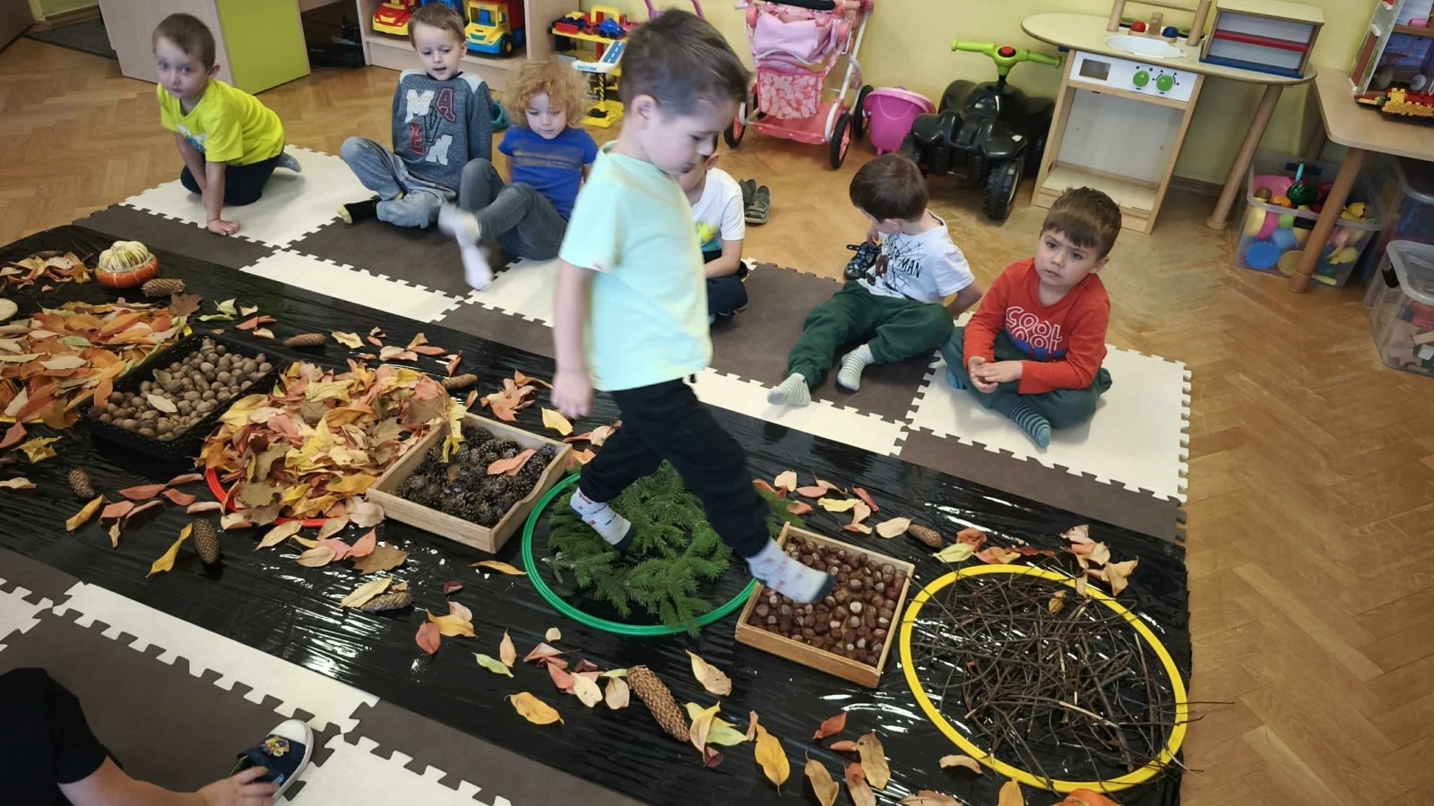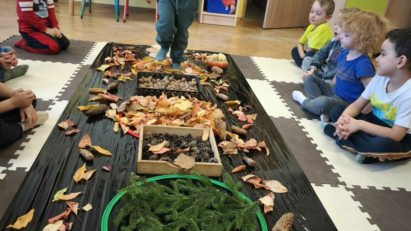 Jesień to idealny czas, aby zaprosić dzieci do odkrywania świata wszystkimi zmysłami. W przedszkolu powstała jesienna ścieżka sensoryczna, która nie tylko pobudzała ciekawość najmłodszych, lecz także wspierała ich rozwój motoryczny i poznawczy. Tor wypełniony był naturalnymi materiałami kojarzącymi się z jesienią: liśćmi, szyszkami czy kasztanami. Taka forma zabawy stymulowała zmysł dotyku, a jednocześnie rozwijała równowagę oraz koordynację ruchową. Świetną okazją do wzmacniania kreatywności, motoryki małej i zmysłu wzroku było również malowanie na folii czy kreślenie wzorów na piasku.