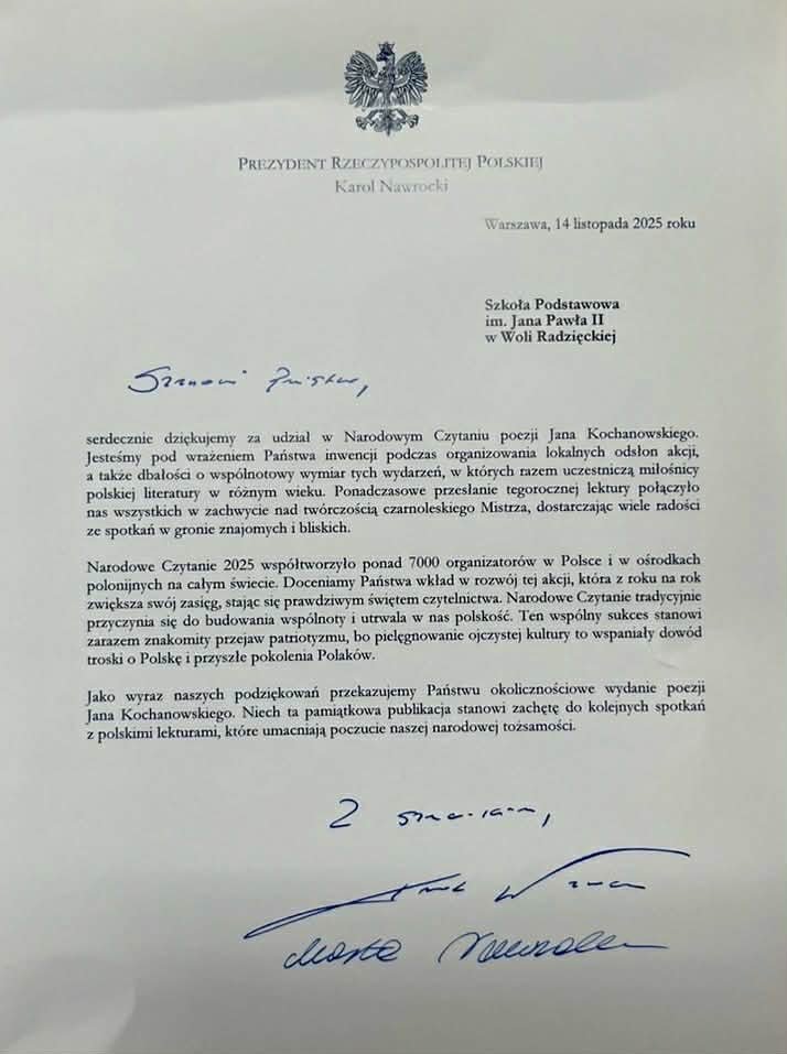 Wraz z publikacją otrzymaliśmy oficjalne podziękowania, w których Para Prezydencka wyraziła uznanie za zaangażowanie uczniów i nauczycieli w promowanie czytelnictwa oraz pielęgnowanie polskiej literatury. To dla nas motywacja, aby nadal aktywnie uczestniczyć w inicjatywach kulturalnych rozwijających wrażliwość i pasję do czytania.