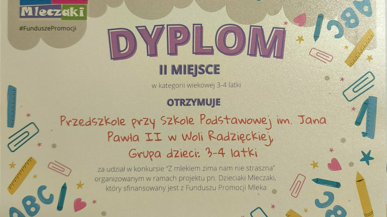 Miło nam poinformować, że grupa 3–4 latków zajęła II miejsce w konkursie plastycznym „Z mlekiem zima nam nie straszna”! Dzieci stworzyły grupową pracę, w której w wyjątkowy sposób pokazały, jak mleko i produkty mleczne pomagają przetrwać zimowe dni. Oprócz pamiątkowego dyplomu dzieci otrzymały zestaw mikroskopów. Gratulujemy!