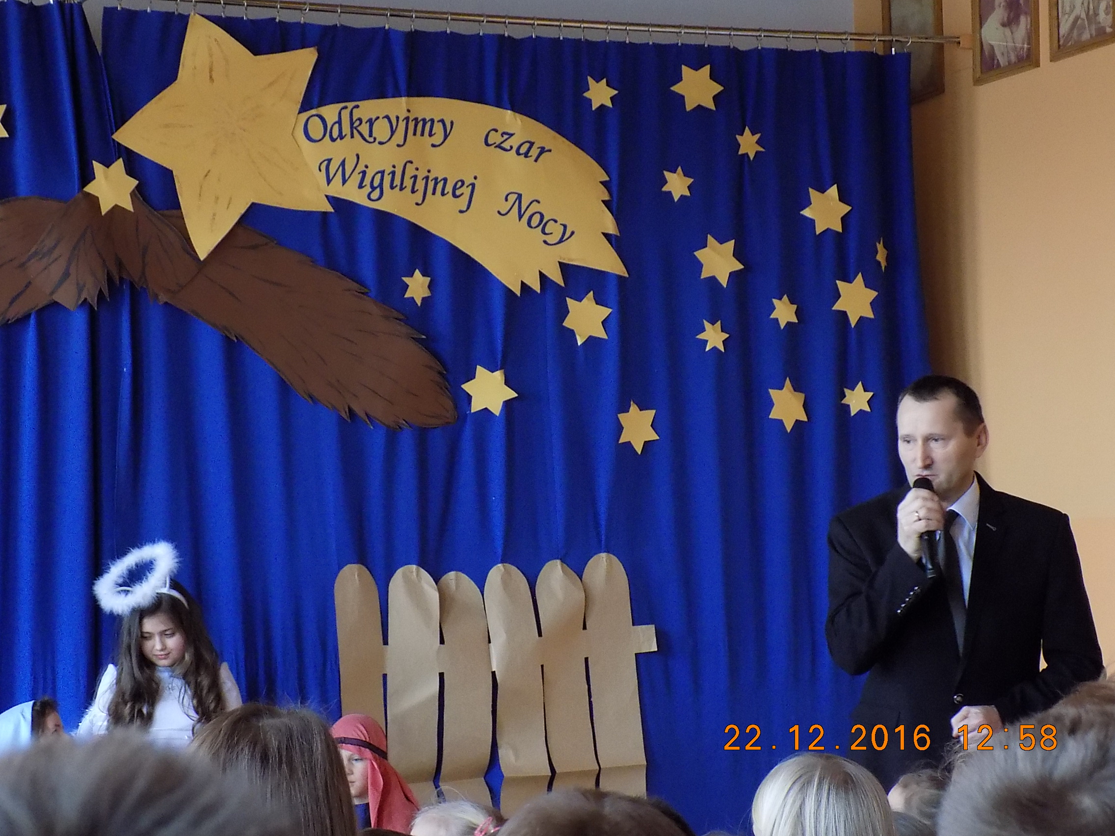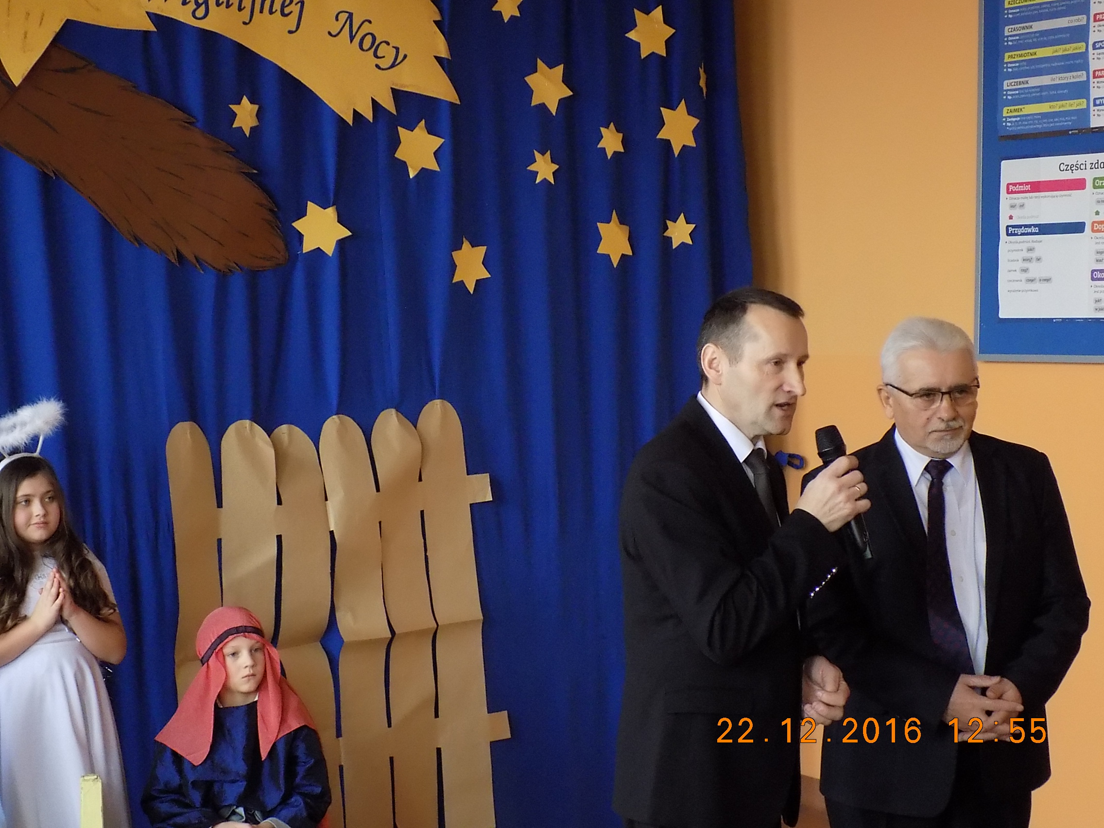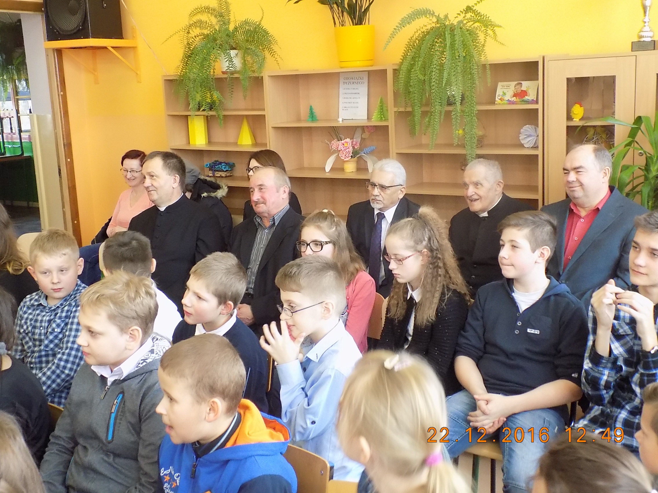 W tym uroczystym dniu zaszczycili nas swoją obecnością Burmistrz Frampola – pan Tadeusz Niedźwiecki, Przewodniczący Rady Miejskiej - pan Wojciech Kowalik, proboszcz parafii Radzięcin - ks. Adam Czupich, ks. Romuald Bekier oraz Przewodnicząca Rady Rodziców - pani Ewelina Liwak. Życzenia świąteczne i noworoczne wszystkim zebranym rodzicom, nauczycielom, pracownikom szkoły i uczniom złożyli Burmistrz - pan Tadeusz Niedźwiecki oraz Dyrektor Szkoły - pan Stanisław Saj.