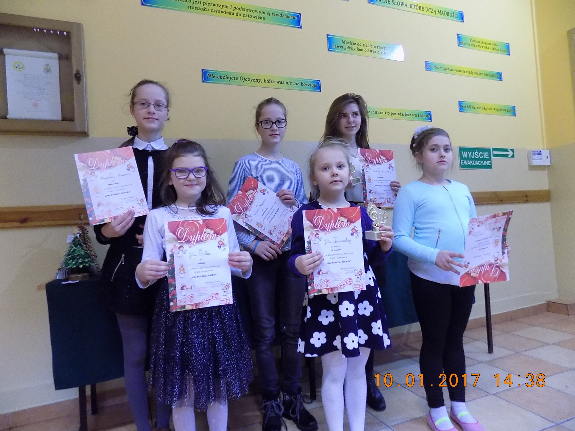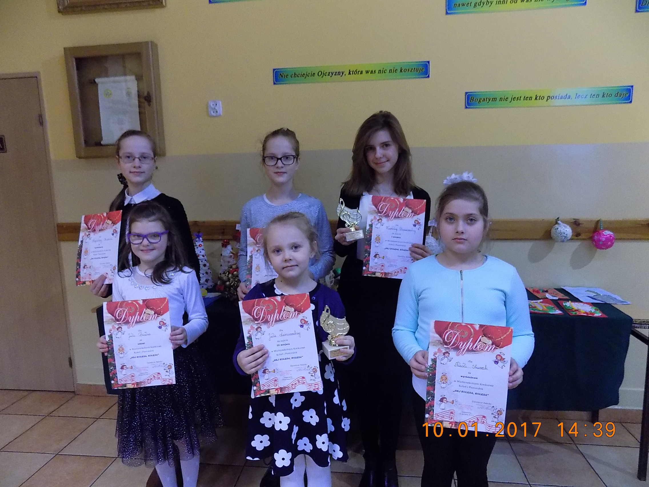 Wzięła w nim udział 6 - osobowa reprezentacja naszej szkoły. Konkurs odbył się w dwóch kategoriach: kl. I-III i kl. IV-VI. Podobnie jak w roku ubiegłym bardzo dobrze wypadli w nim nasi uczniowie. W kategorii kl. I-III, 3 miejsce zajęła Julka Leśniewska z kl. II, a wyróżnienie otrzymała Nikola Skurzak z kl. III. Podziękowanie za udział w Konkursie otrzymała Julka Białas z kl. III. W kategorii kl. IV-VI, 1 miejsce zdobyła bezapelacyjnie Karolina Brzozowska z kl. VI, której wykonanie "Kolędy dla nieobecnych" spodobało się nie tylko Jury konkursu, ale i publiczności. Wyróżnienia w tej kategorii zdobyły siostry: Magda i Wiktoria Kaziród z kl. VI. Zdobywcy miejsc 1-3 w obu kategoriach otrzymali dyplomy i pamiątkowe statuetki, natomiast wyróżnieni i pozostali uczestnicy konkursu - okolicznościowe dyplomy. Gratulacje!