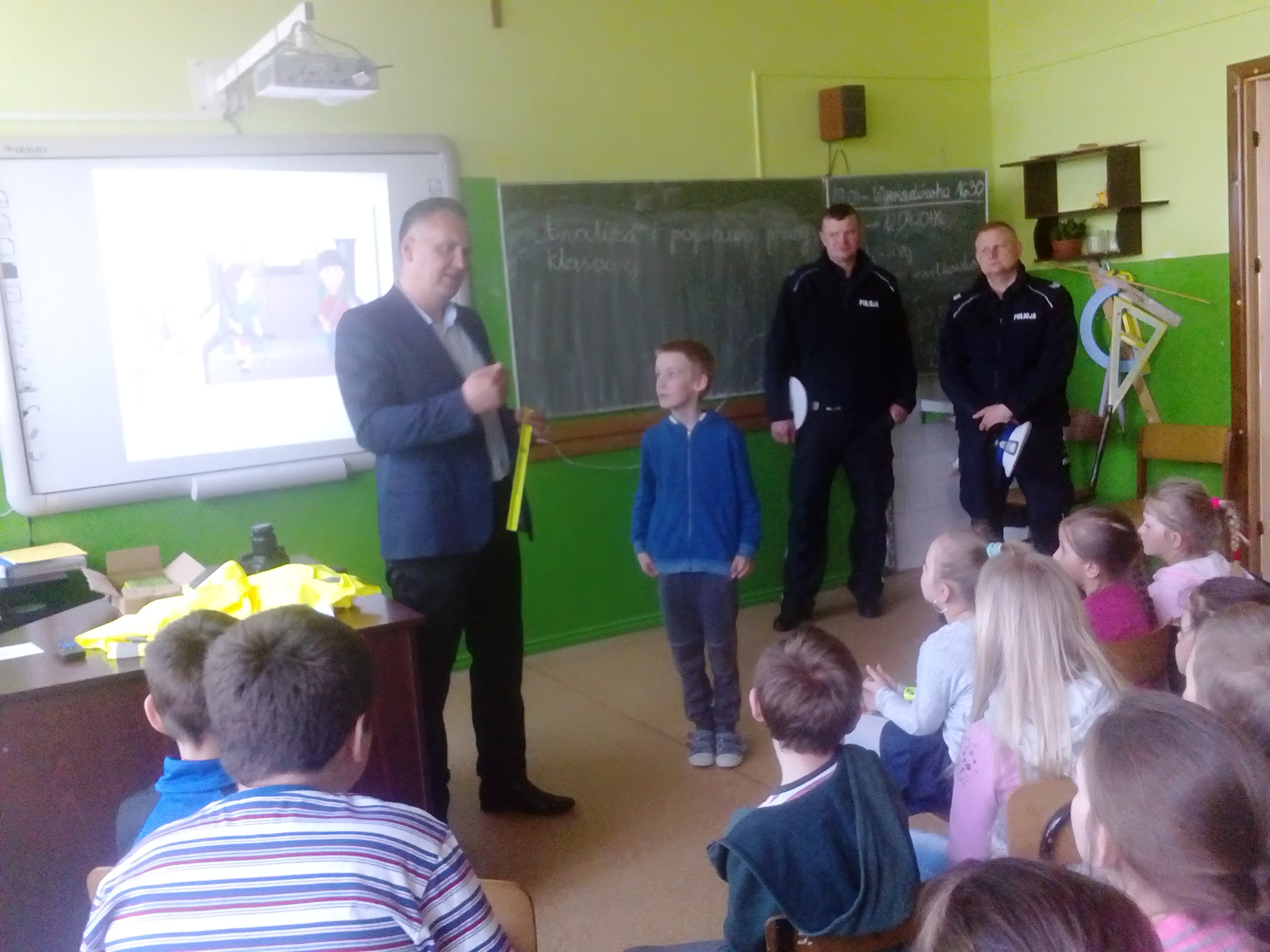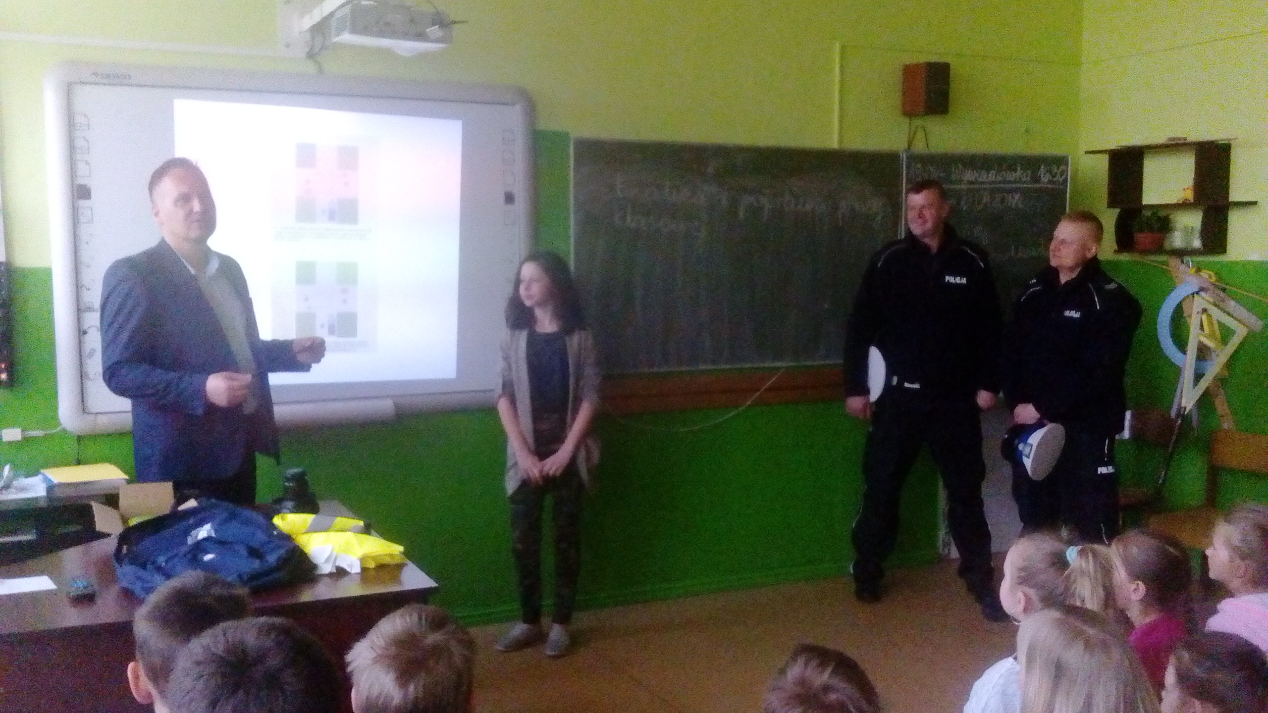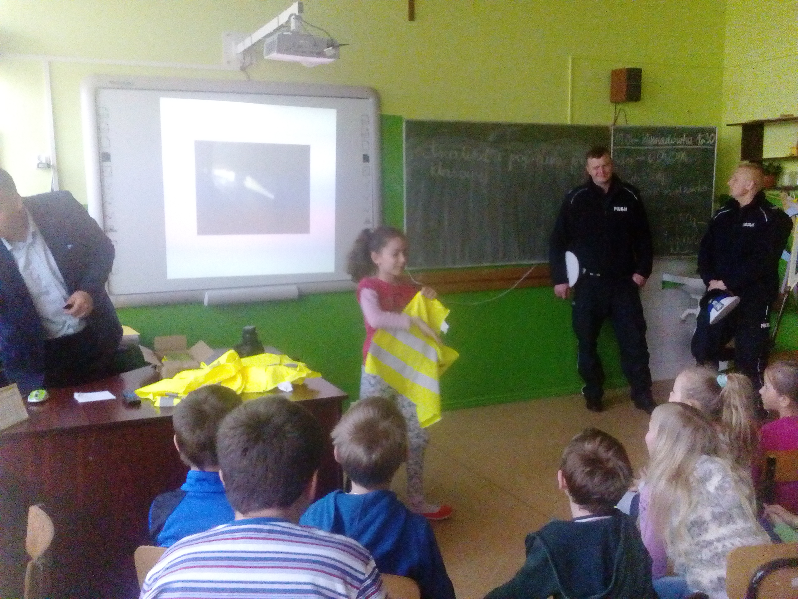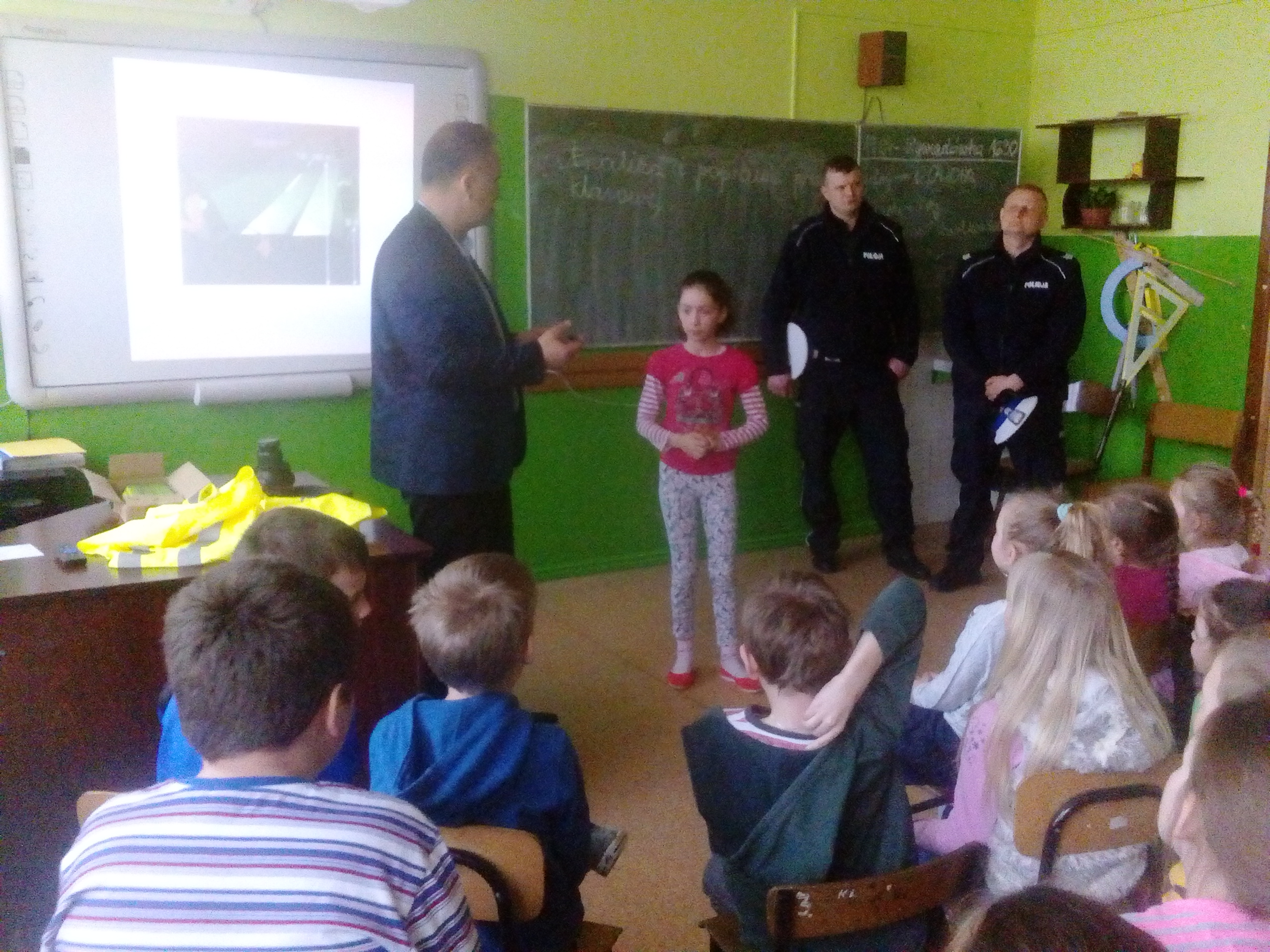 Dzieciaki obejrzały najpierw film dotyczący bezpieczeństwa na drodze, następnie wysłuchały pogadanki oraz odpowiadały na pytania przybyłych gości. Najlepsi otrzymali w nagrodę plecaki. Wszystkie dzieci zostały obdarowane ponadto opaskami - odblaskami. Na zakończenie uczniowie wraz z nauczycielami udali się na plac przed szkołą, gdzie policjanci zaprezentowali zgromadzonym wyposażenie radiowozu oraz wyjaśnili jego przeznaczenie.