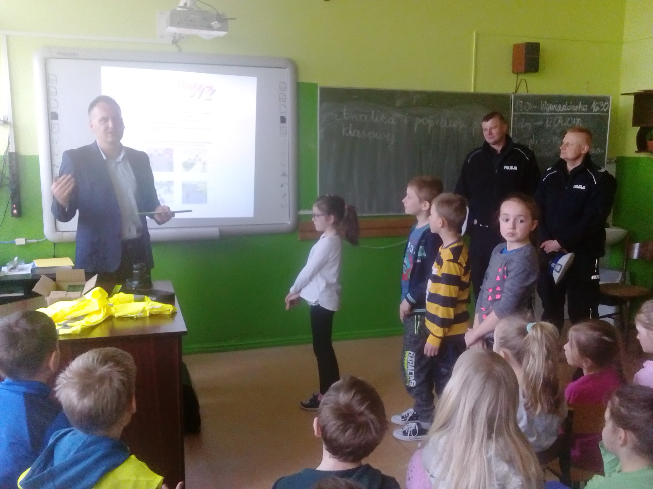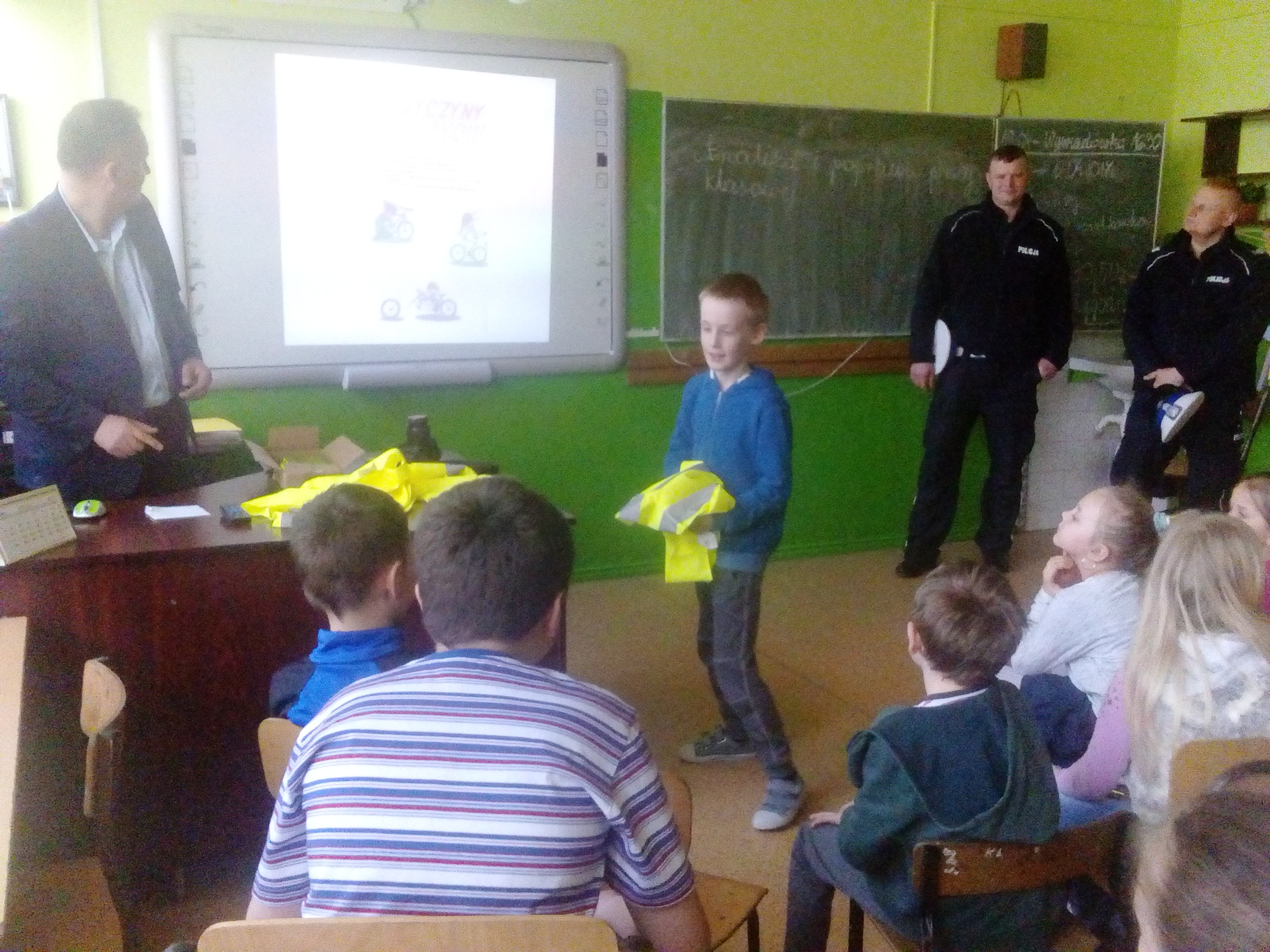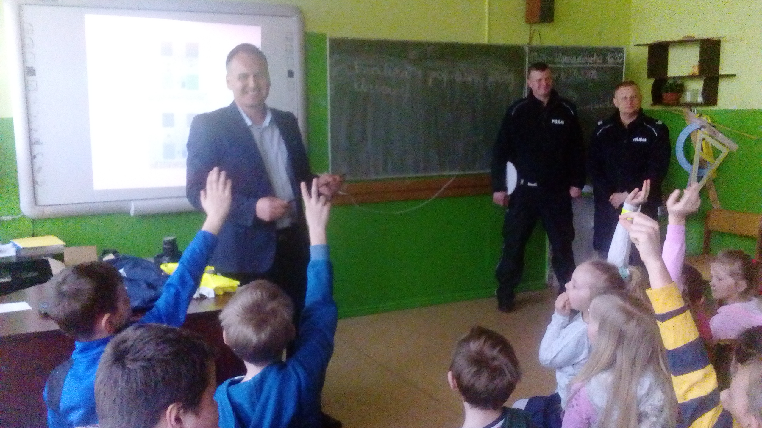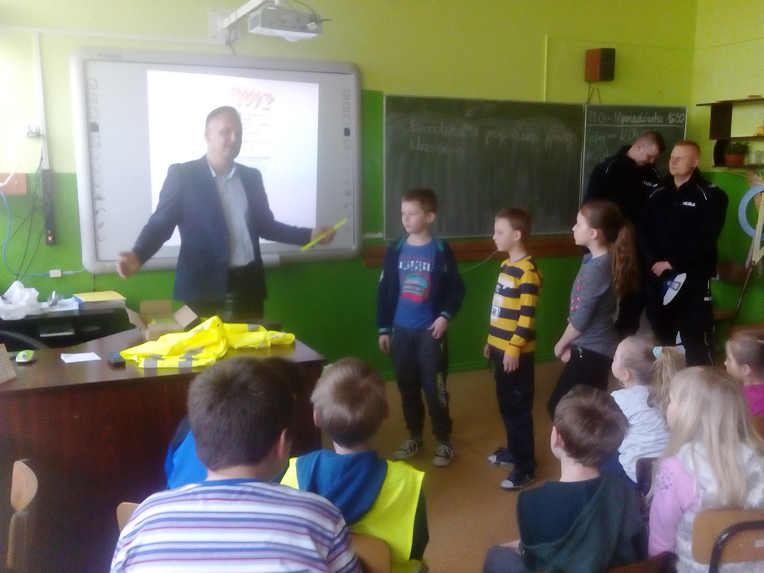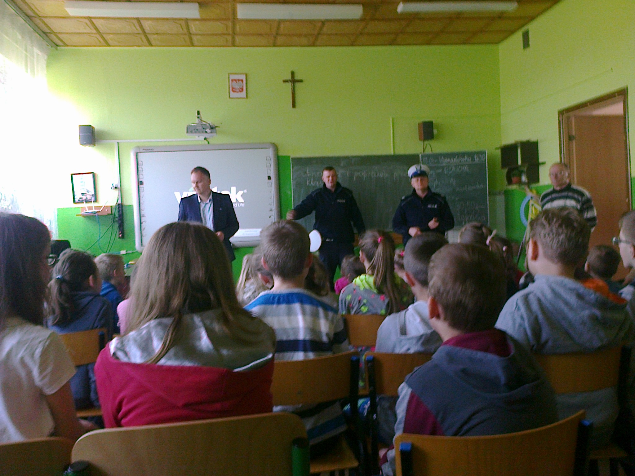 Dzieciaki obejrzały najpierw film dotyczący bezpieczeństwa na drodze, następnie wysłuchały pogadanki oraz odpowiadały na pytania przybyłych gości. Najlepsi otrzymali w nagrodę plecaki. Wszystkie dzieci zostały obdarowane ponadto opaskami - odblaskami. Na zakończenie uczniowie wraz z nauczycielami udali się na plac przed szkołą, gdzie policjanci zaprezentowali zgromadzonym wyposażenie radiowozu oraz wyjaśnili jego przeznaczenie.