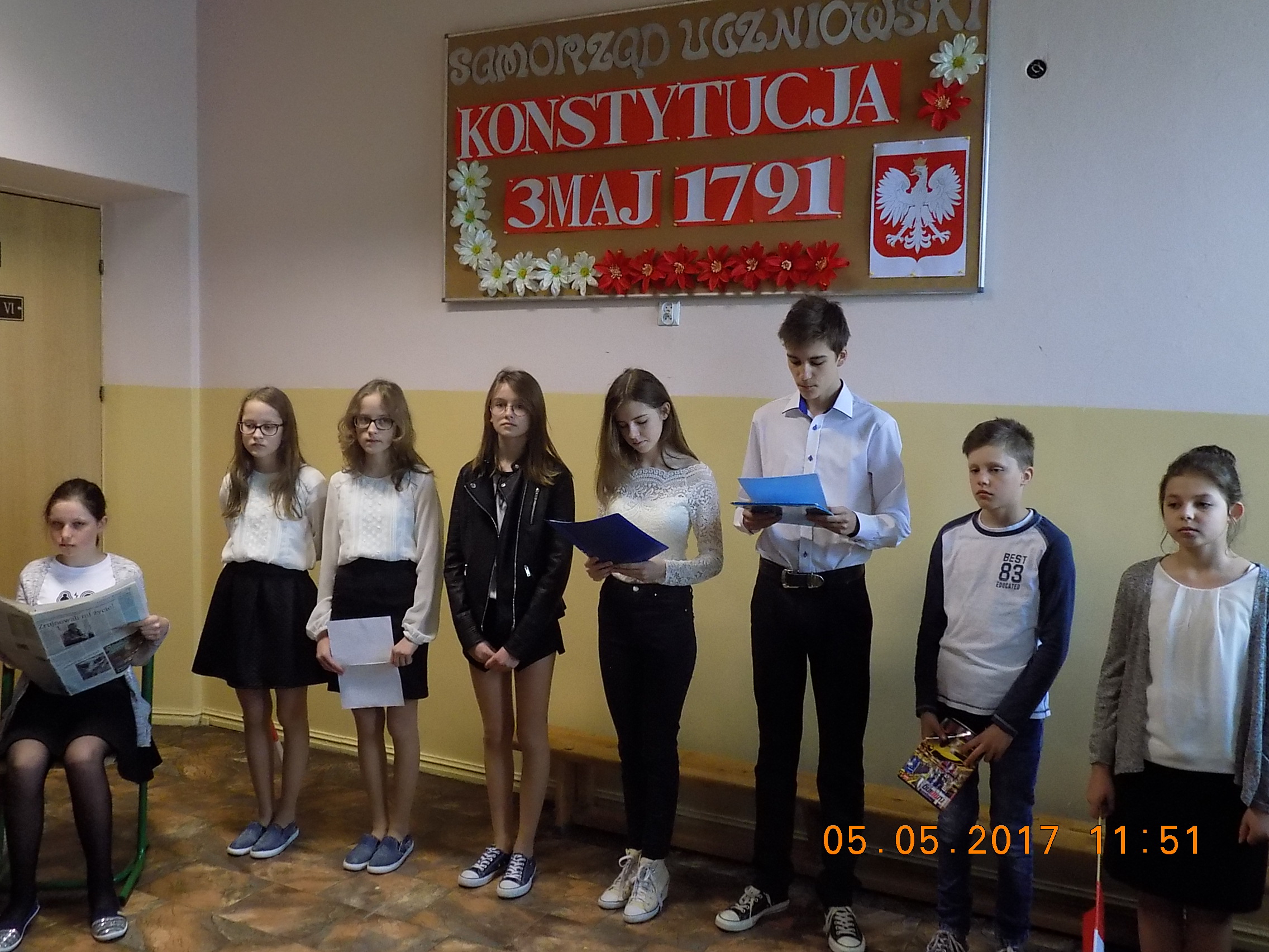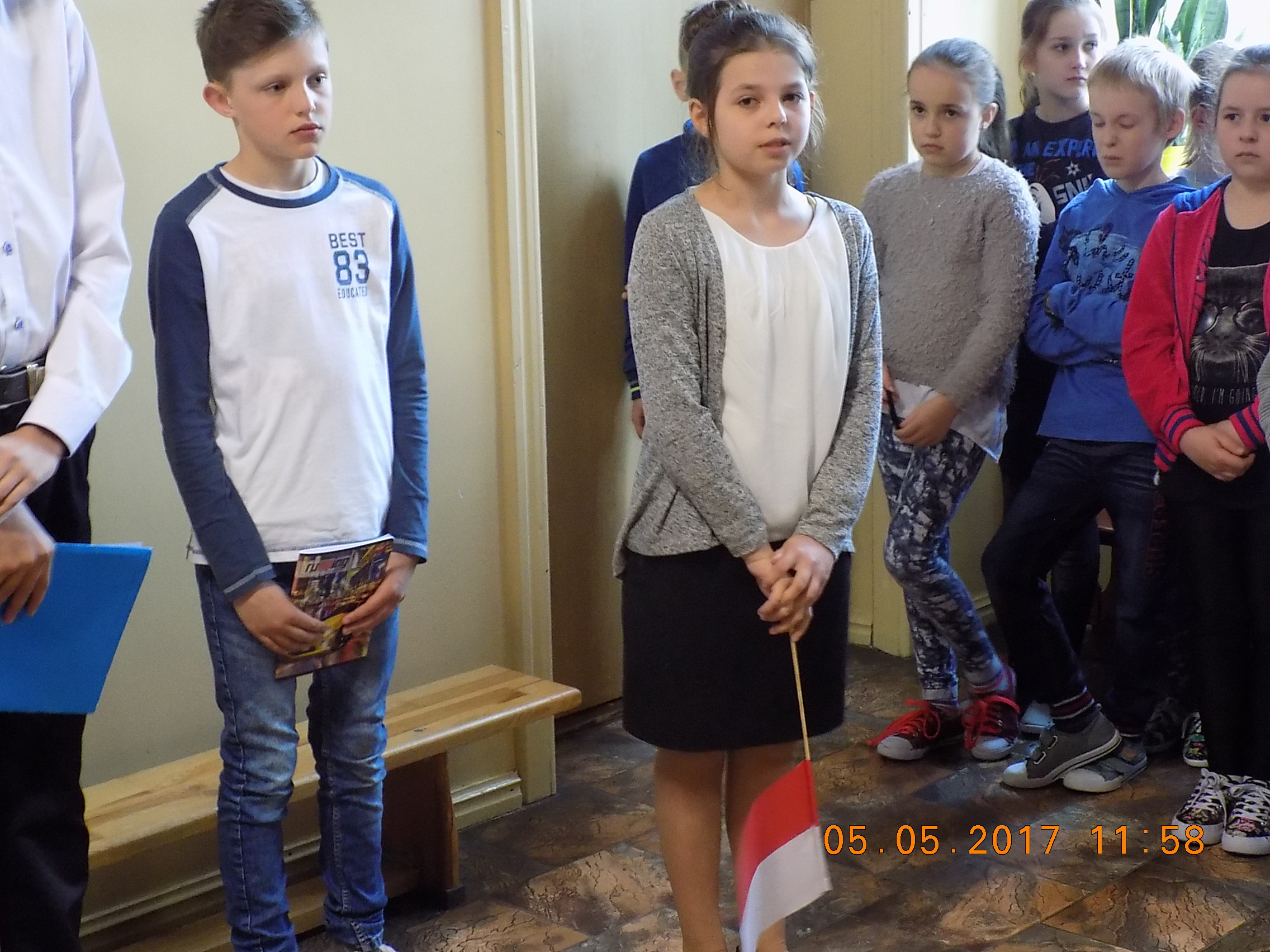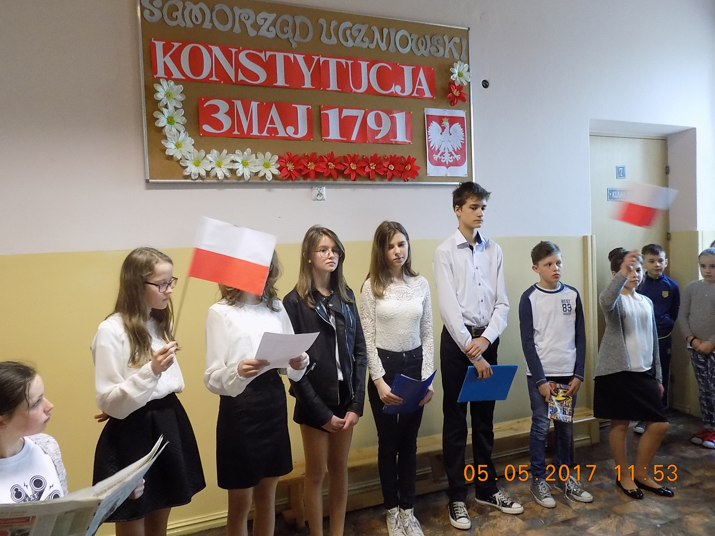 5 maja zatrzymaliśmy się na chwilę i wysłuchaliśmy krótkiej lekcji historii i patriotyzmu, którą w formie apelu przygotowała grupa uczniów z klas V-VI. Recytatorzy słowami wierszy zachęcali wszystkich do dumy z naszej Ojczyzny,do pielęgnowania naszej tożsamości narodowej. O wolność i prawa walczyli Polacy przez wiele lat. Wymowne słowa przysięgi Rafała (syna) w przedstawionej scence z Julką (mamą) szczególnie wzruszyły słuchaczy: "Przysięgam, że będę zawsze kochał wszystkich, że się nie będę kłócił, że się będę dobrze uczył, że nie będę robił krzywdy nikomu". Życzylibyśmy sobie, by ta obietnica dotyczyła całej społeczności szkolnej.