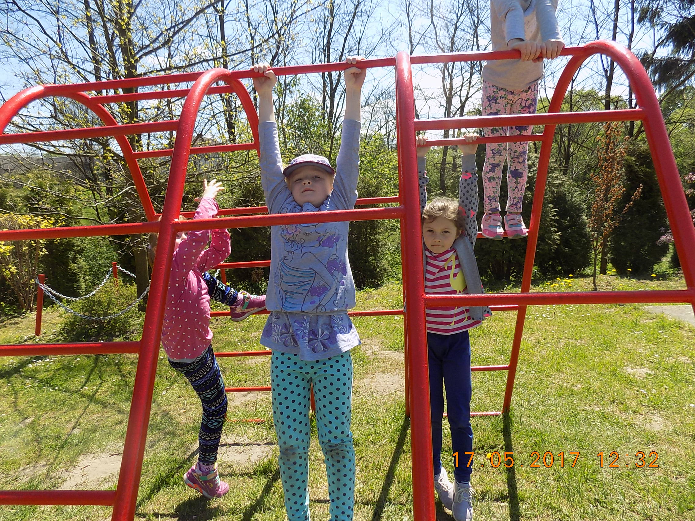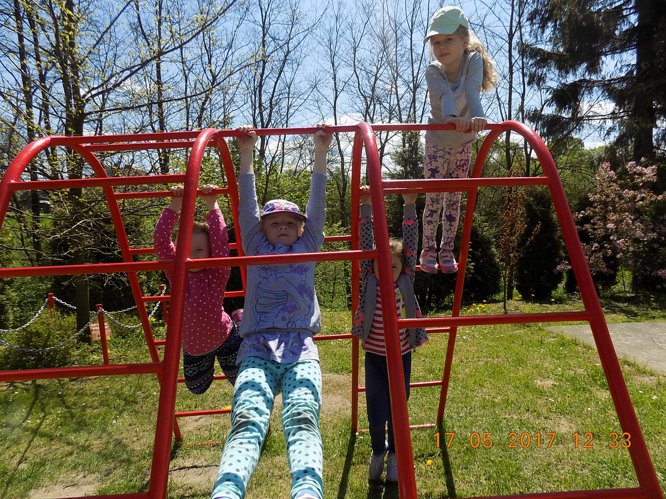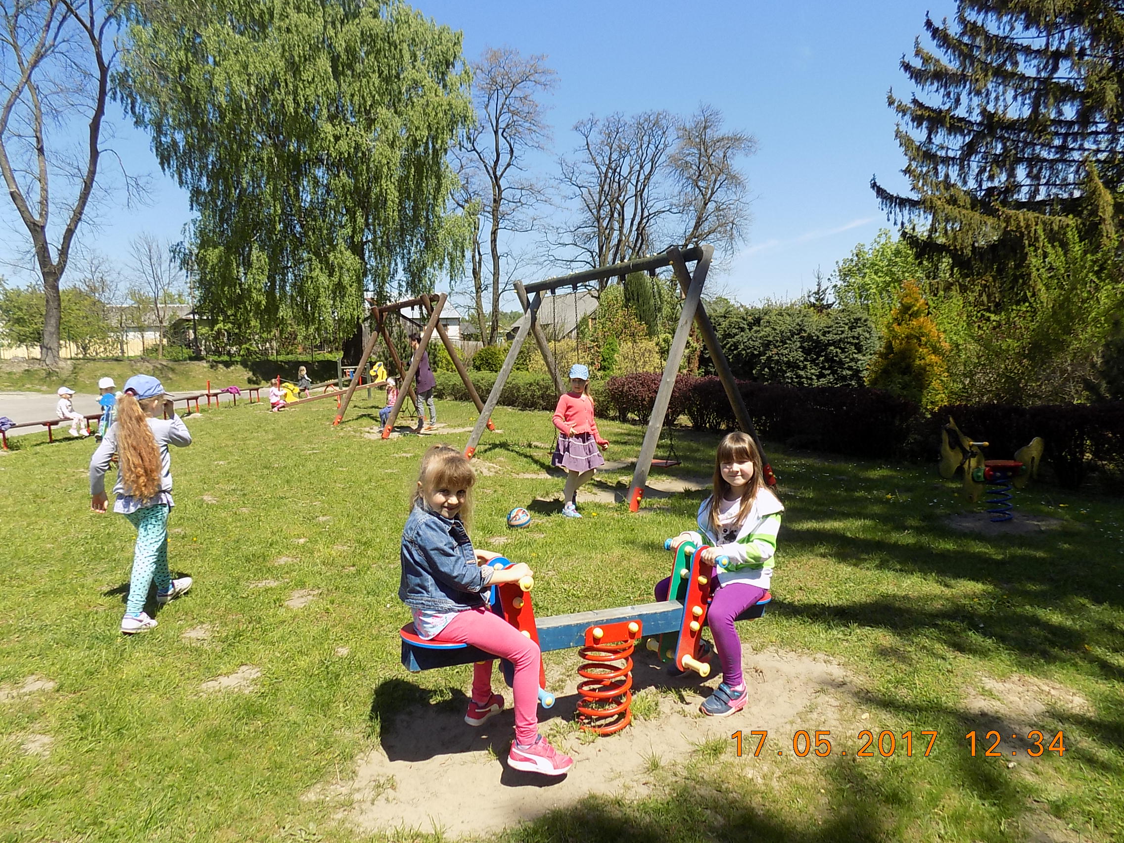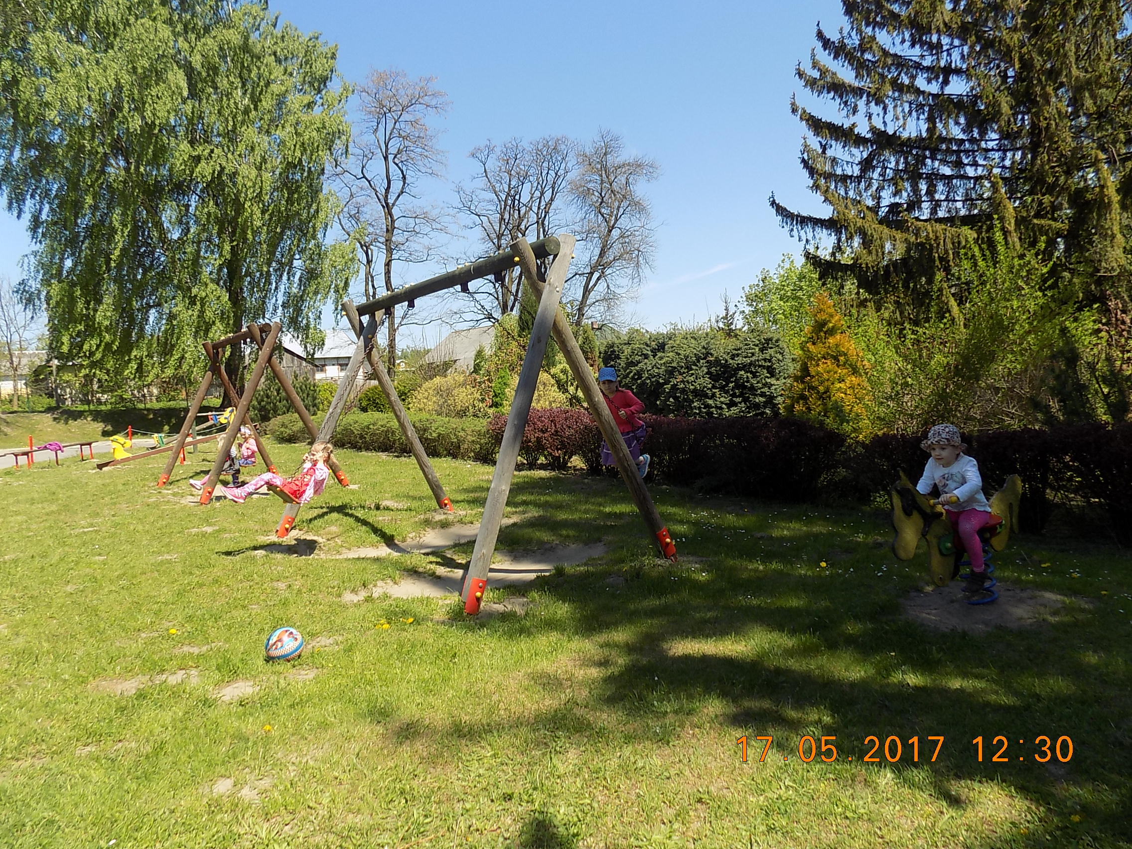 W czasie wesołych harców na placu zabaw dzieci kształtują swoją zwinność, zręczność, siłę i wytrzymałość. Mają też okazję pograć w piłkę, pobiegać sobie oraz poobserwować i podziwiać piękno przyrody na wiosnę.