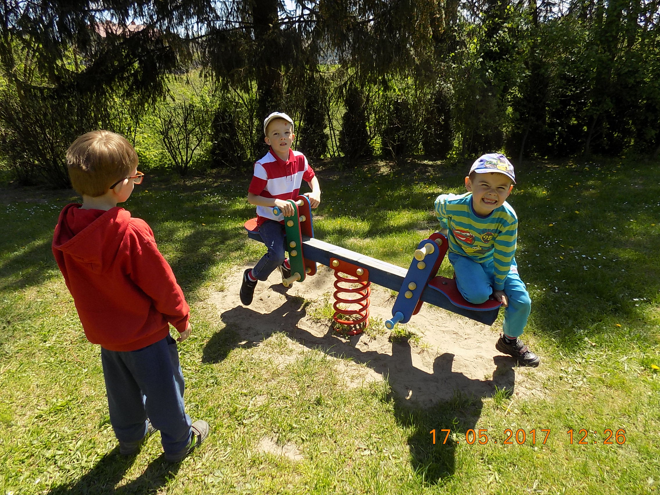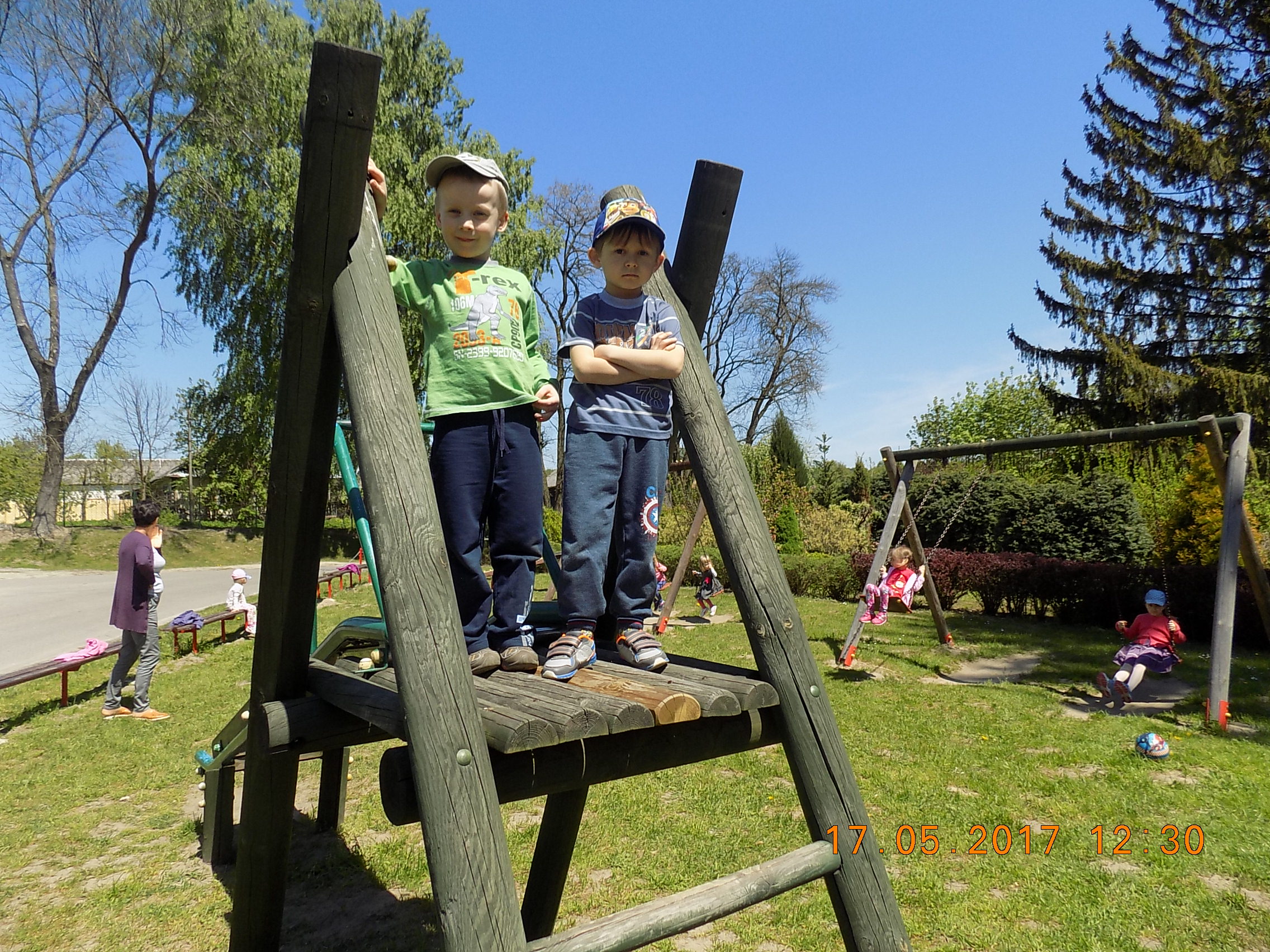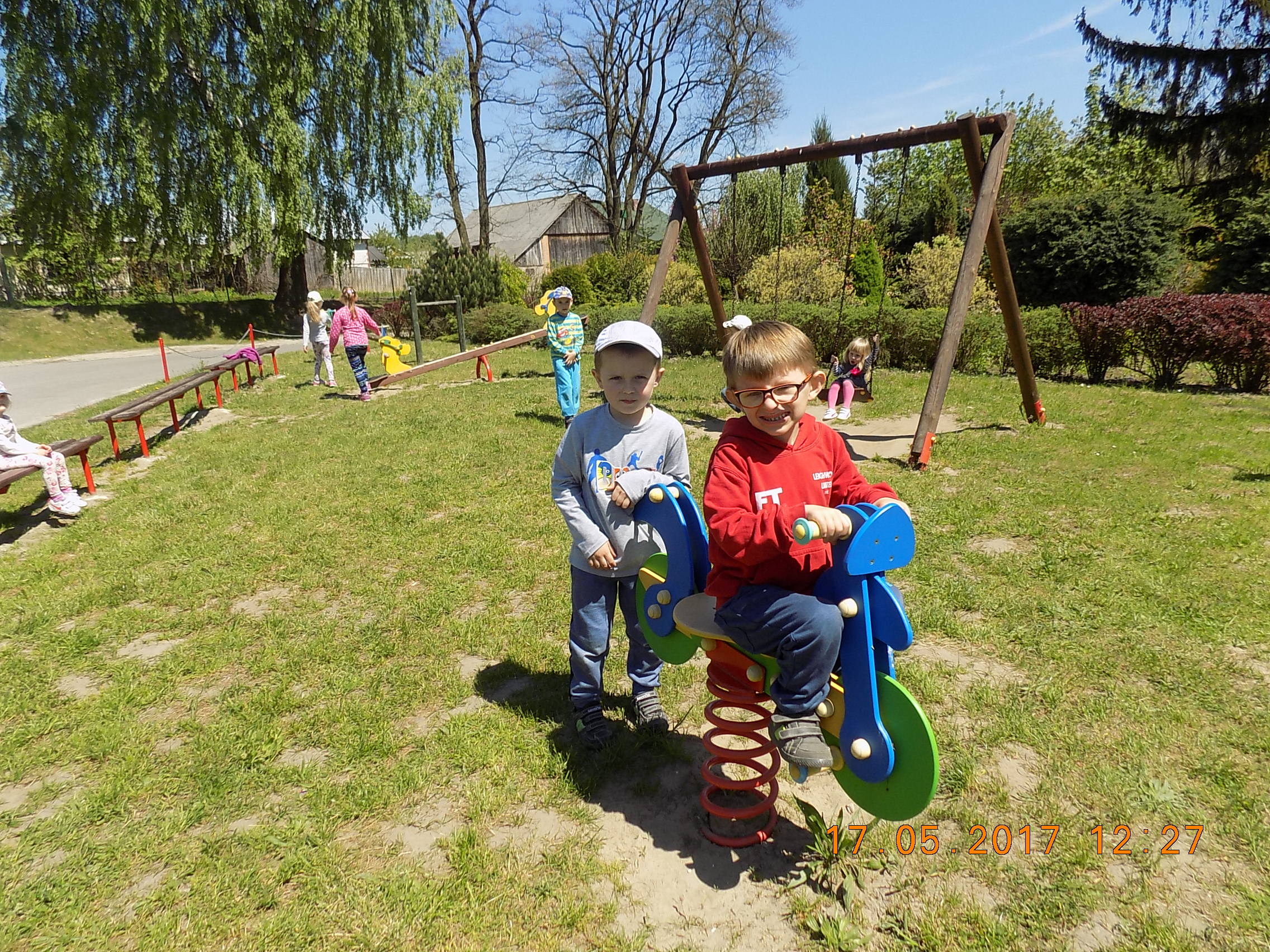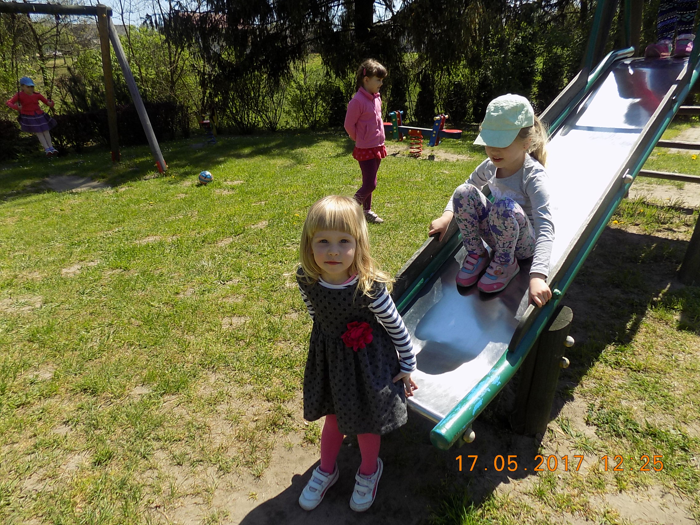 W czasie wesołych harców na placu zabaw dzieci kształtują swoją zwinność, zręczność, siłę i wytrzymałość. Mają też okazję pograć w piłkę, pobiegać sobie oraz poobserwować i podziwiać piękno przyrody na wiosnę.