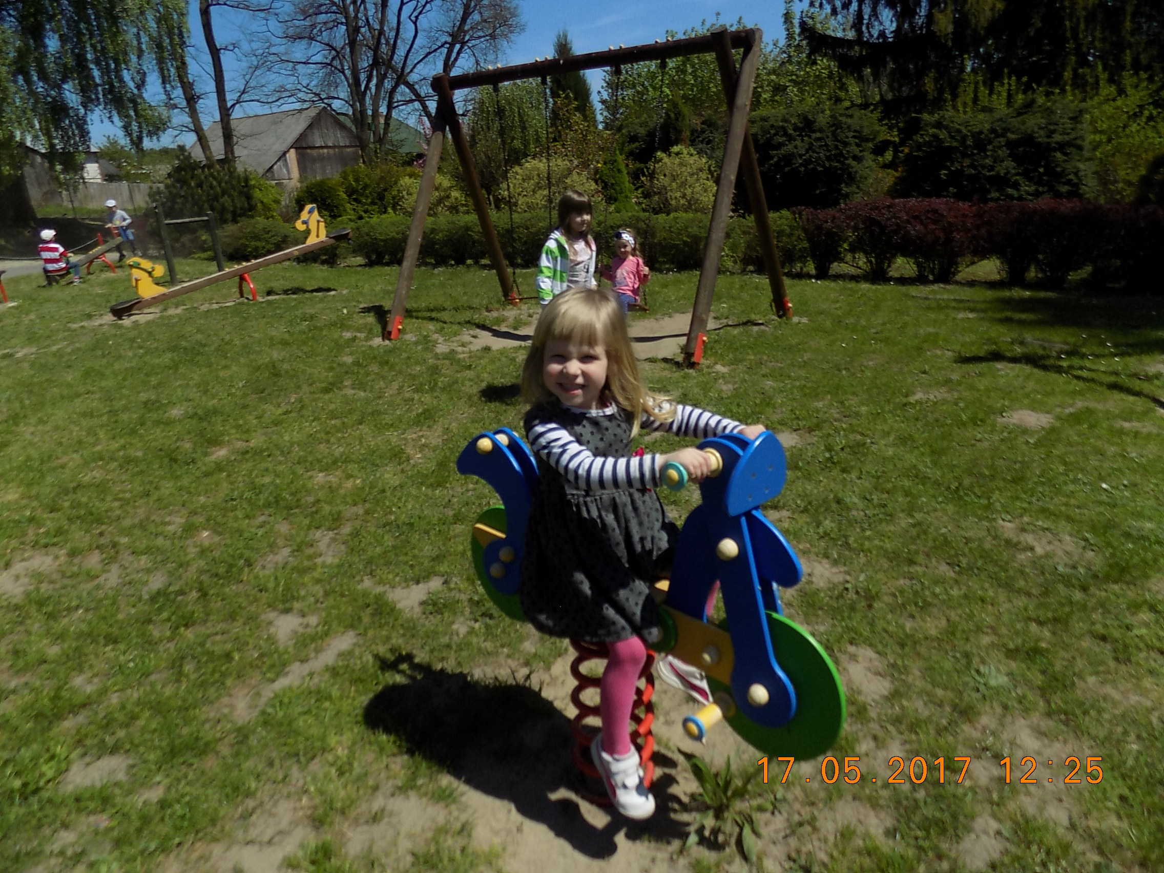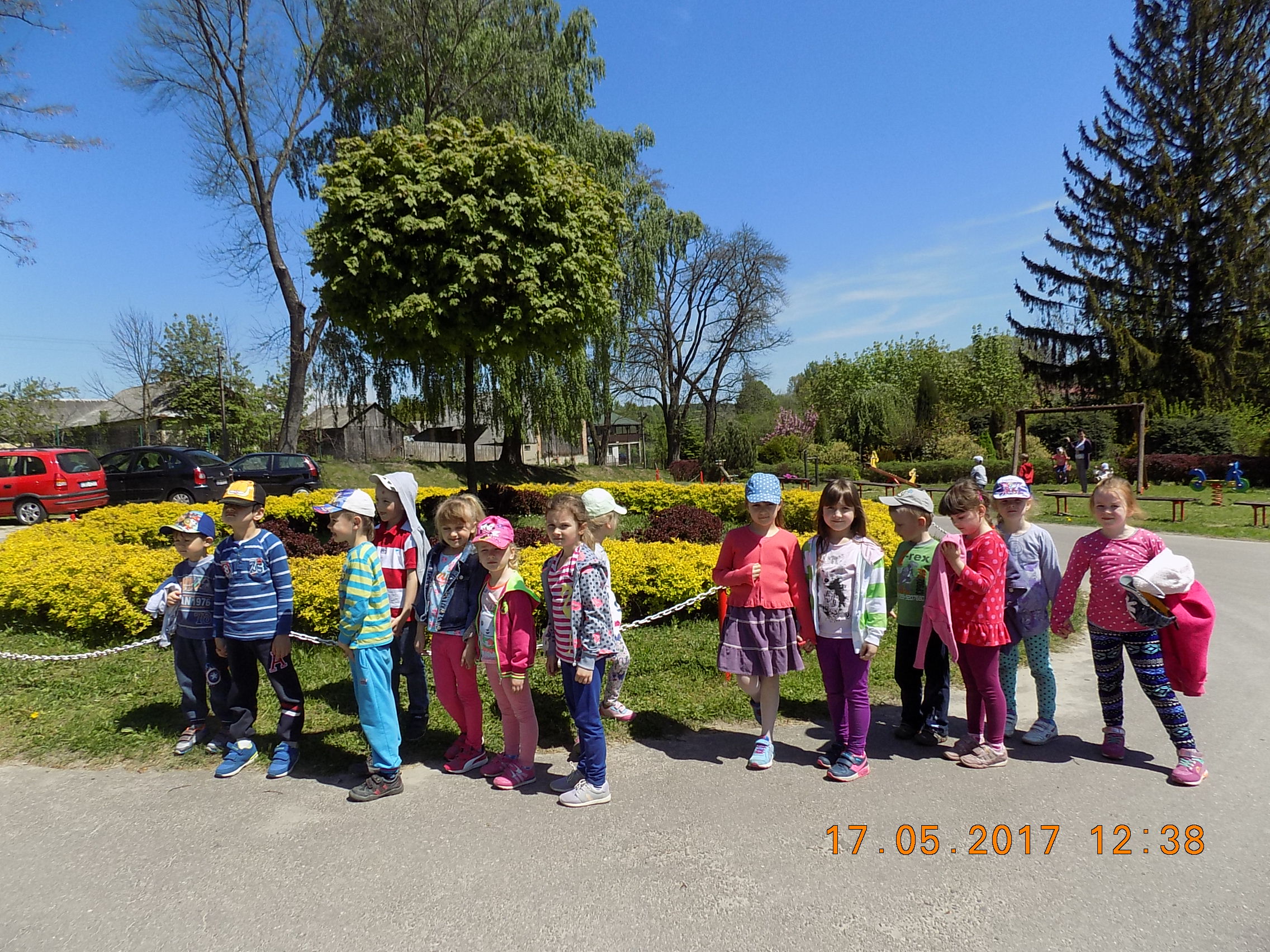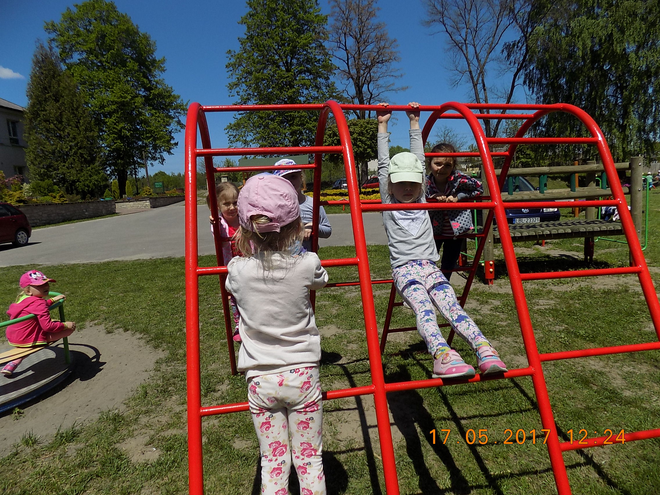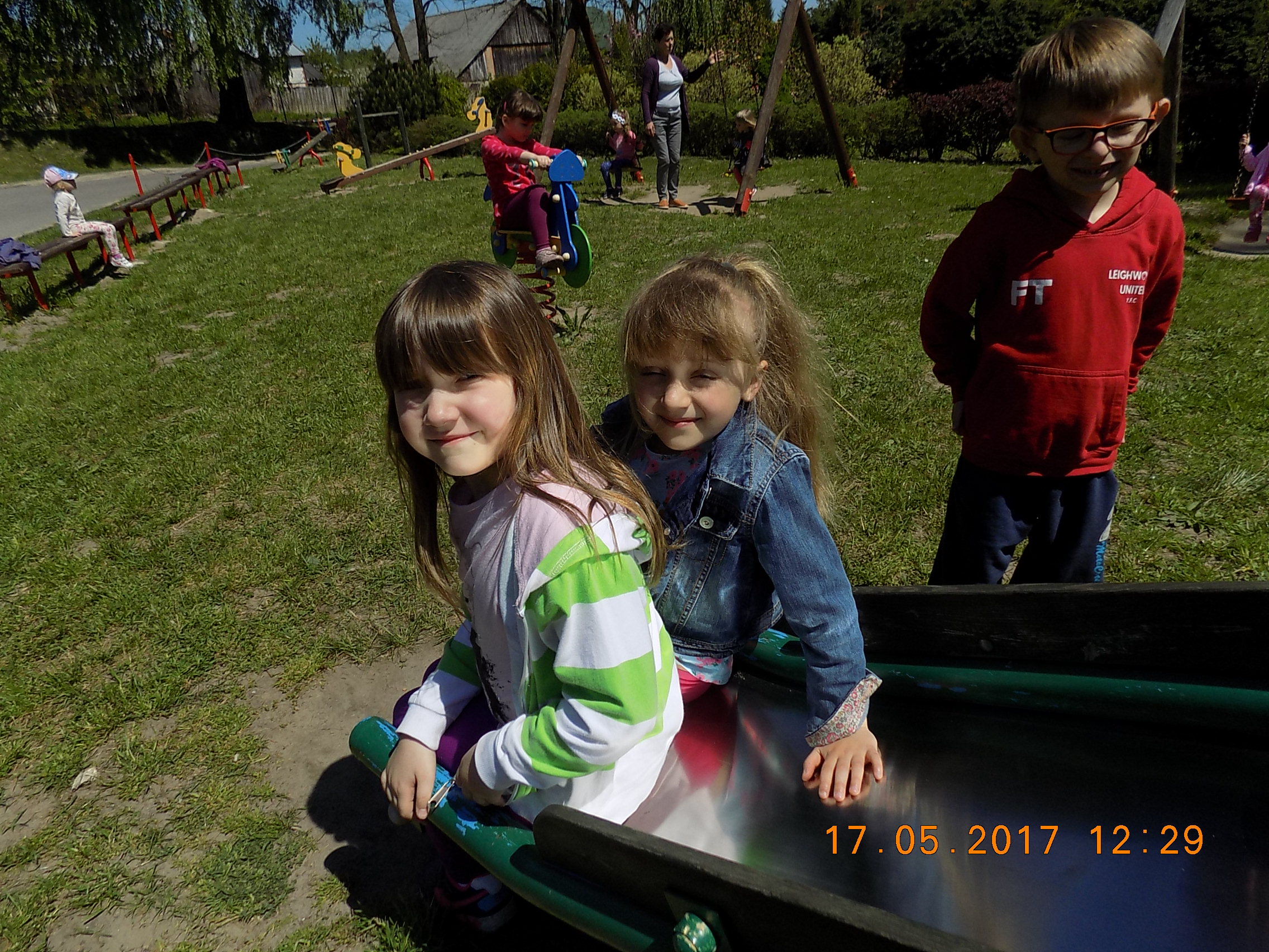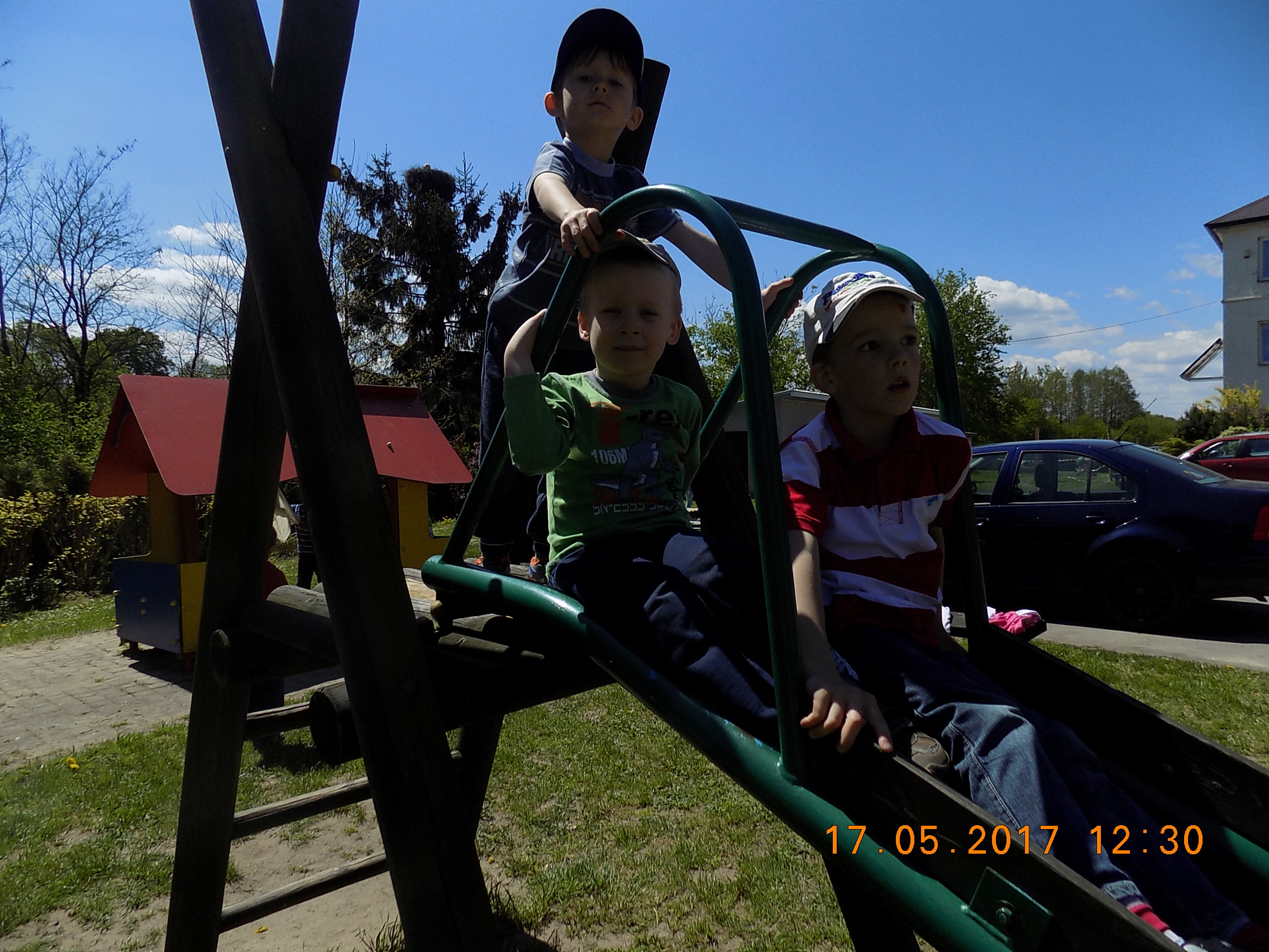 W czasie wesołych harców na placu zabaw dzieci kształtują swoją zwinność, zręczność, siłę i wytrzymałość. Mają też okazję pograć w piłkę, pobiegać sobie oraz poobserwować i podziwiać piękno przyrody na wiosnę.