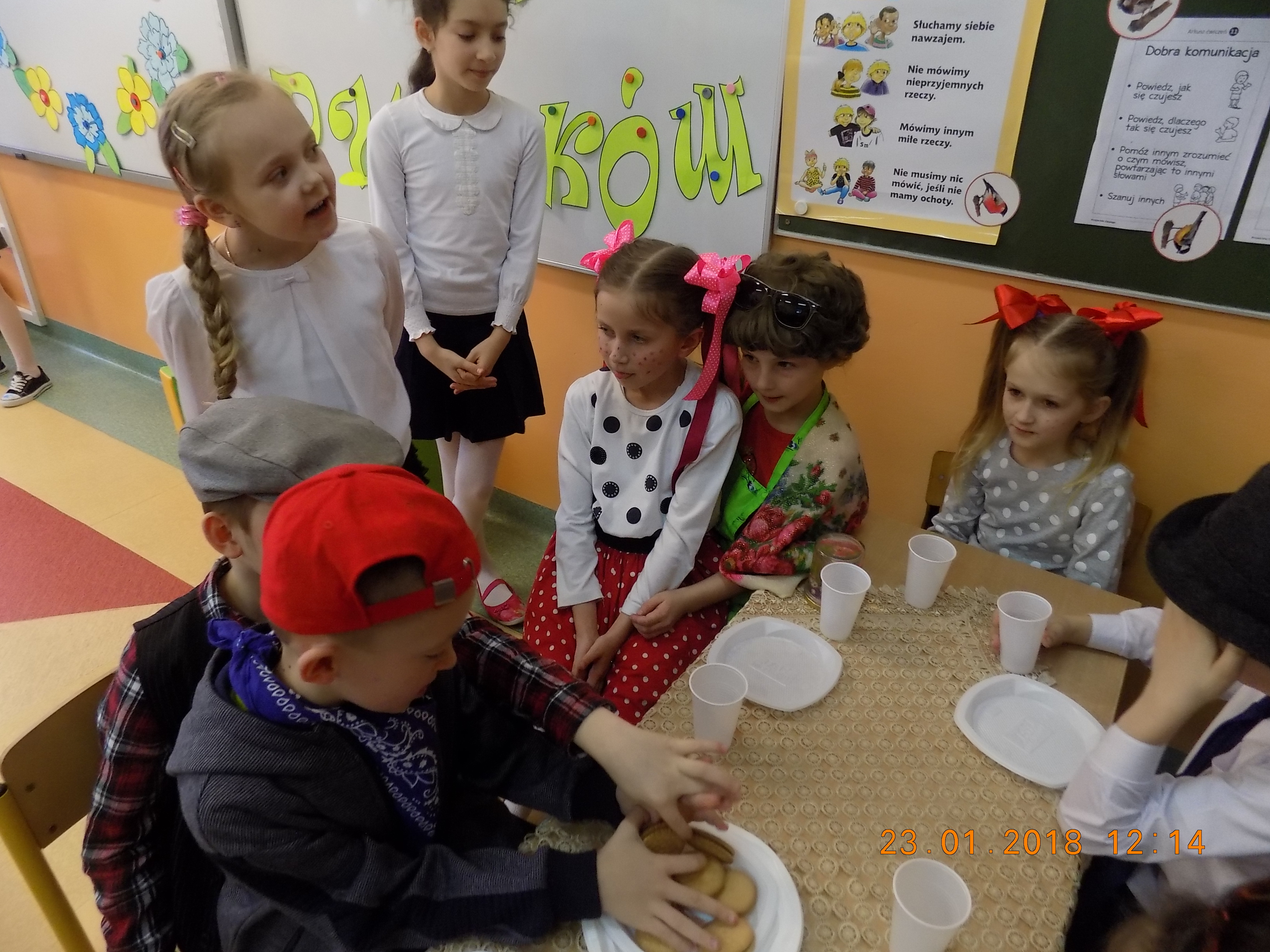 Dyrektor szkoły bardzo gorąco wszystkich przywitał a dzieci przedstawiły piękny program artystyczny: inscenizacje, wzruszające wiersze i piosenki okolicznościowe, związane tematycznie z tymże świętem. Wręczyły też kwiatki i laurki. Rodzice przygotowali poczęstunek w postaci ciasta, kawy i herbaty.