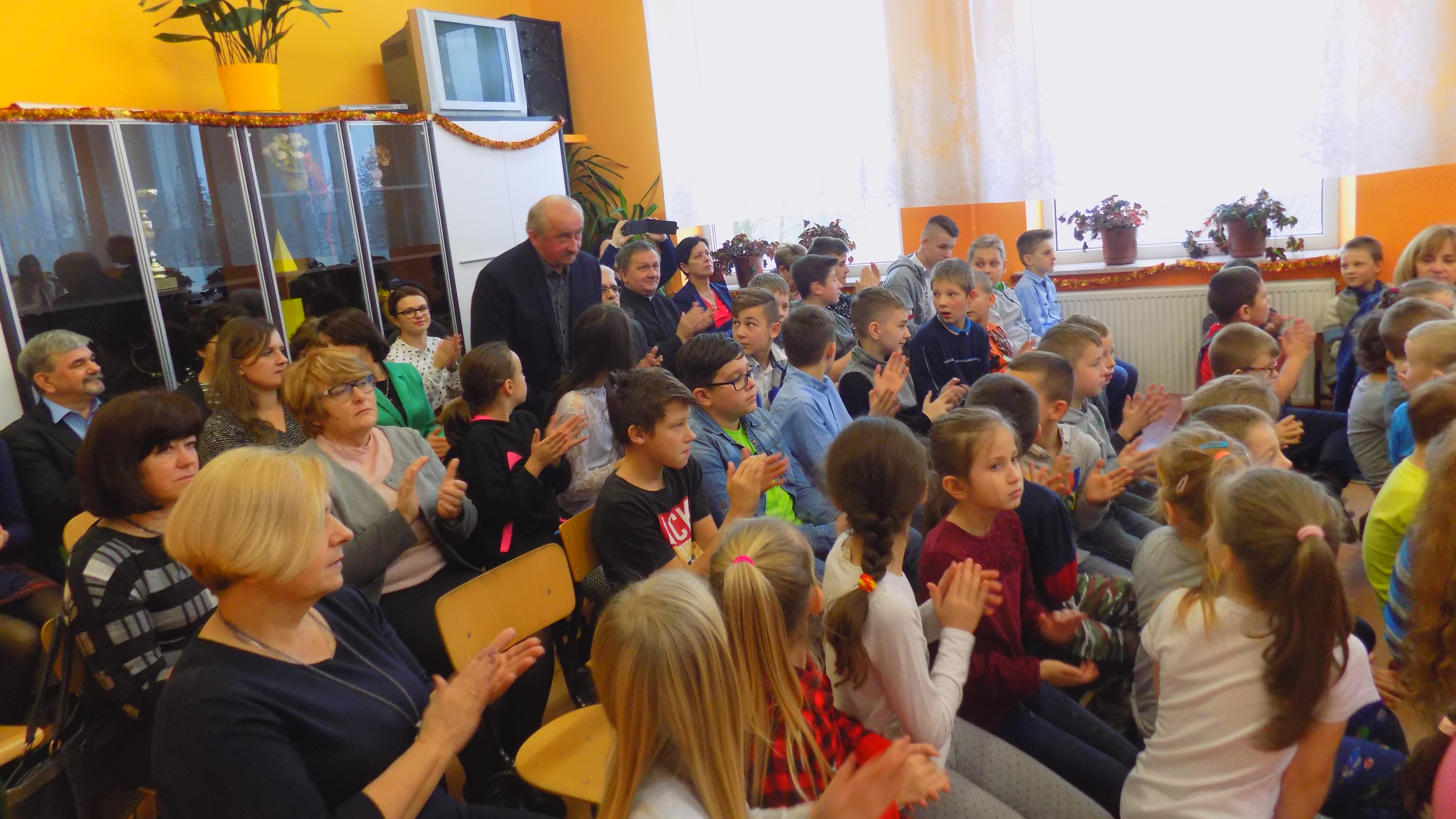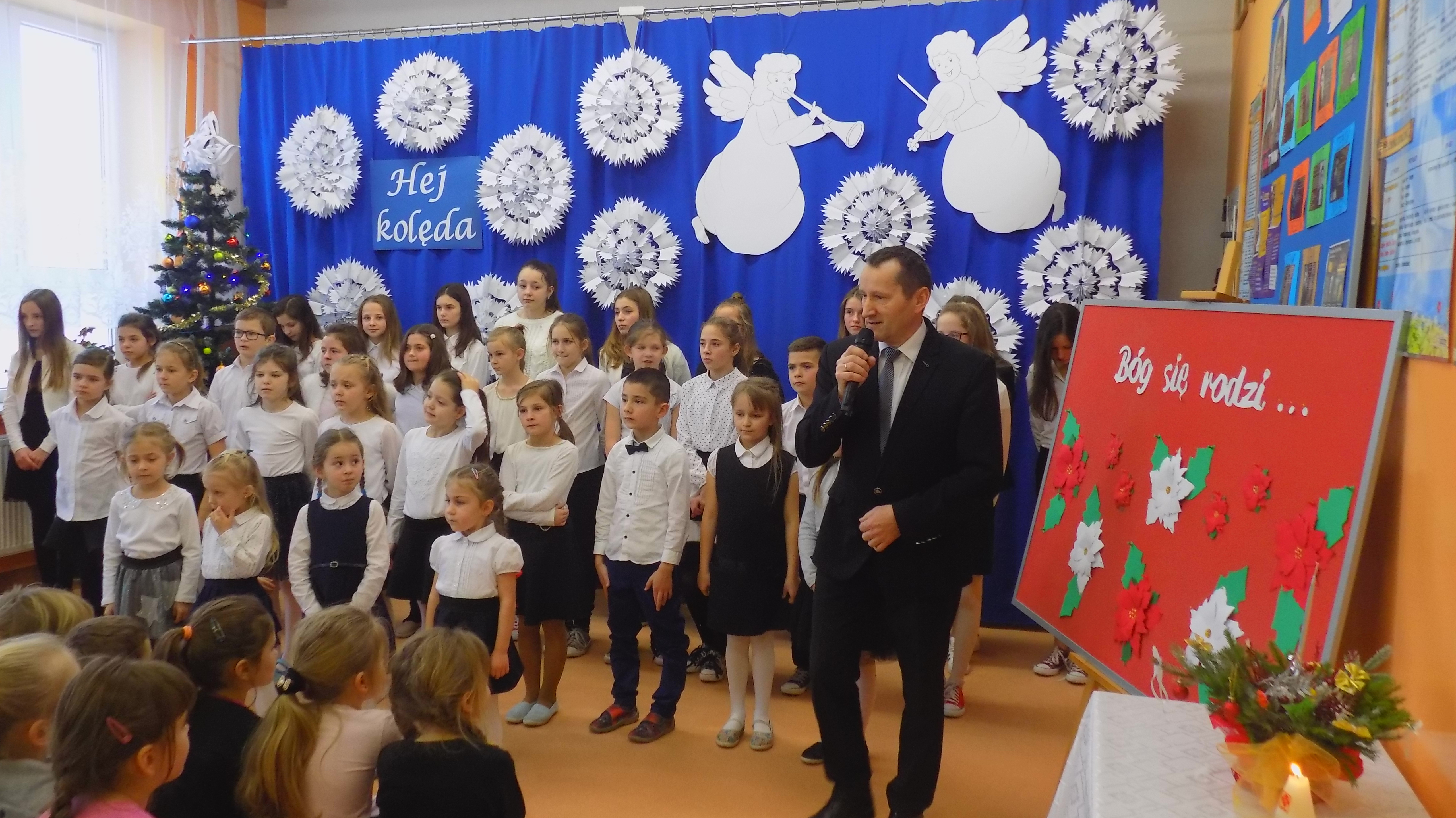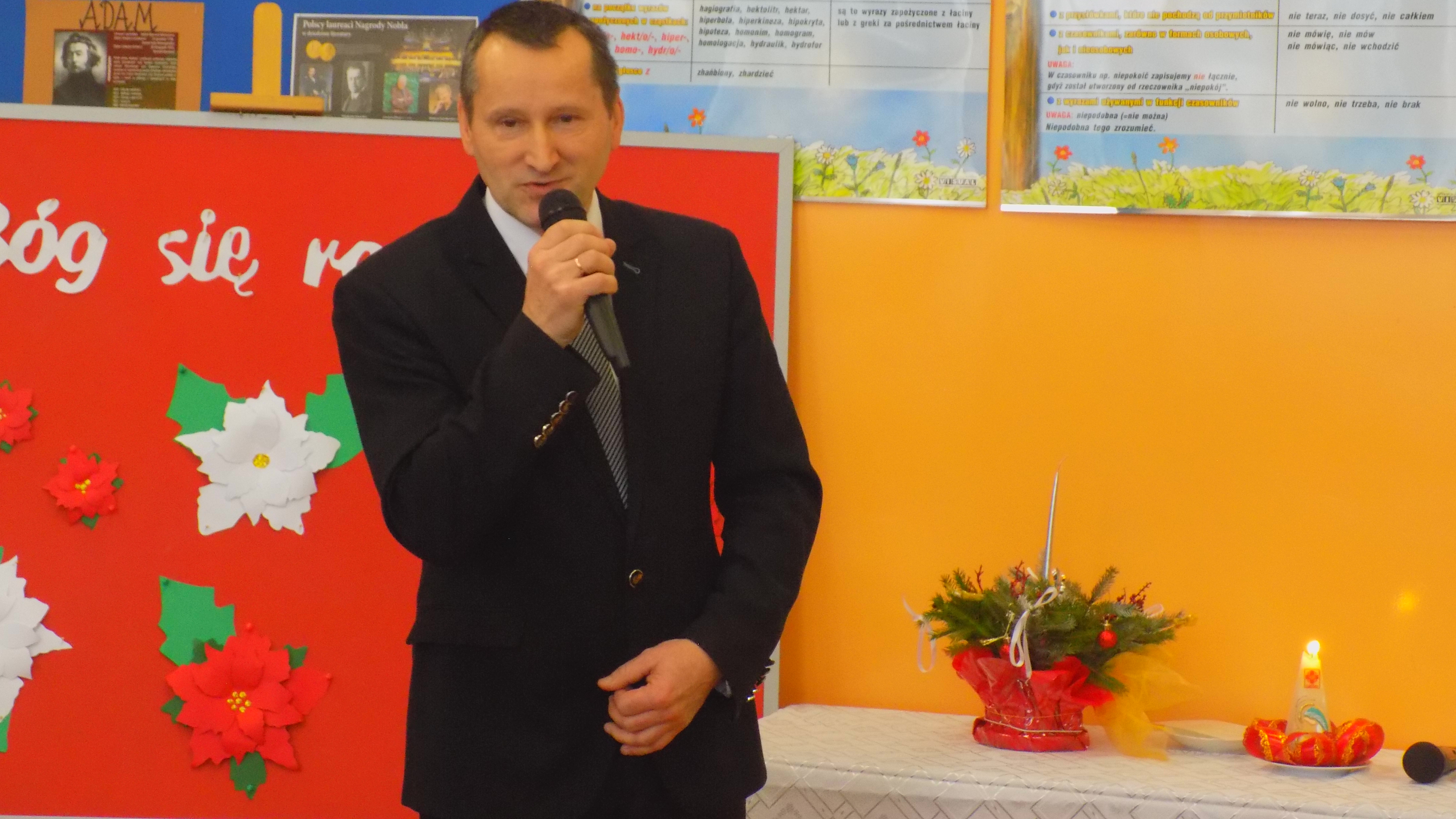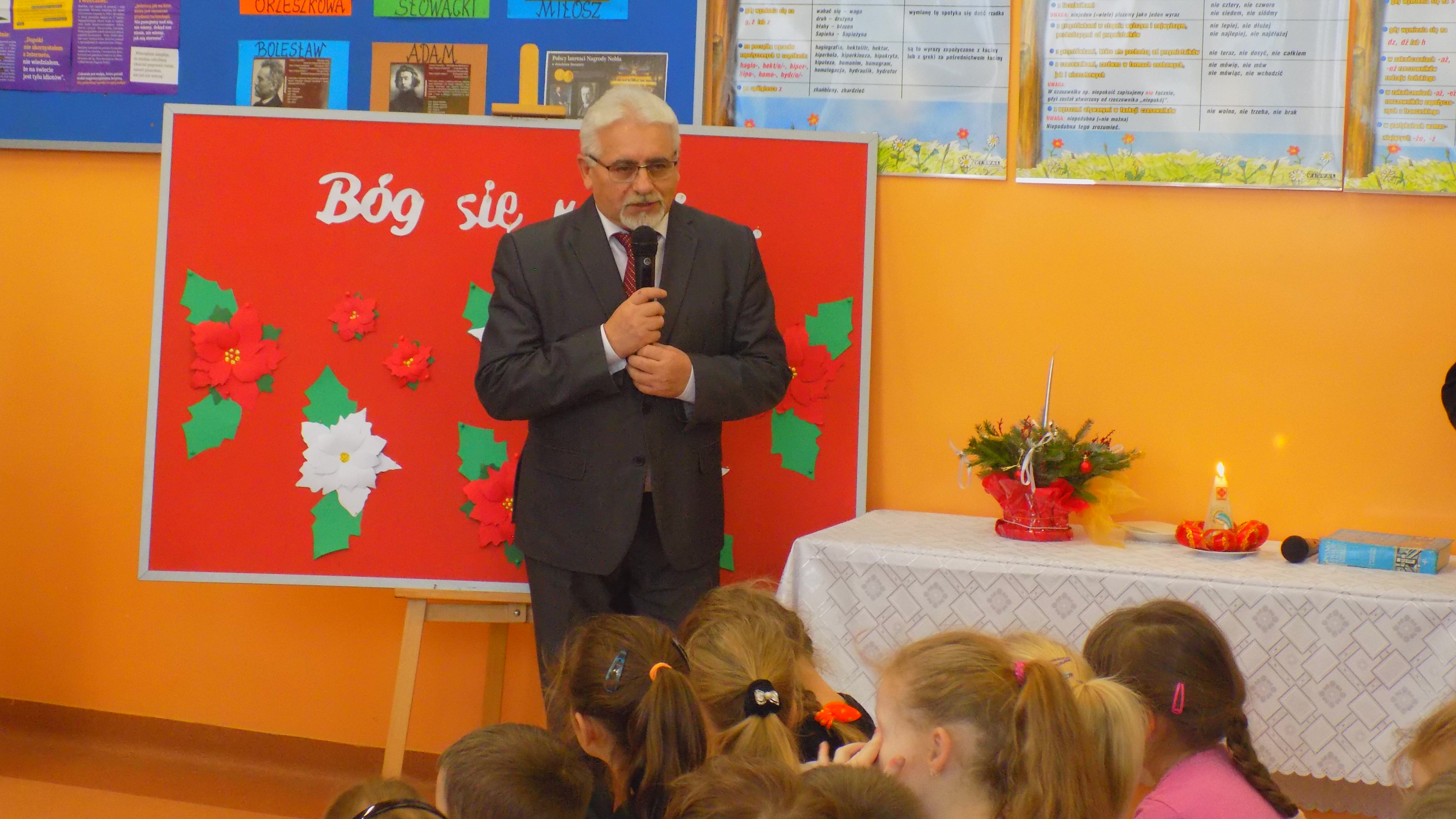 W tym uroczystym dniu zaszczycili nas swoją obecnością Burmistrz Frampola – pan Tadeusz Niedźwiecki, Przewodniczący Rady Miejskiej - pan Wojciech Kowalik, proboszcz parafii Radzięcin - ks. Adam Czupich, ks. Krzysztof Paluch oraz Przewodnicząca Rady Rodziców - pani Teodora Rapa, Zastępca Przewodniczącej Rady Rodziców - pani Beata Zalewa, Skarbnik Rady Rodziców – pani Barbara Łata. Życzenia świąteczne i noworoczne wszystkim zebranym rodzicom, nauczycielom, pracownikom szkoły i uczniom złożyli Dyrektor Szkoły - pan Stanisław Saj, Burmistrz - pan Tadeusz Niedźwiecki oraz ks. Adam Czupich.