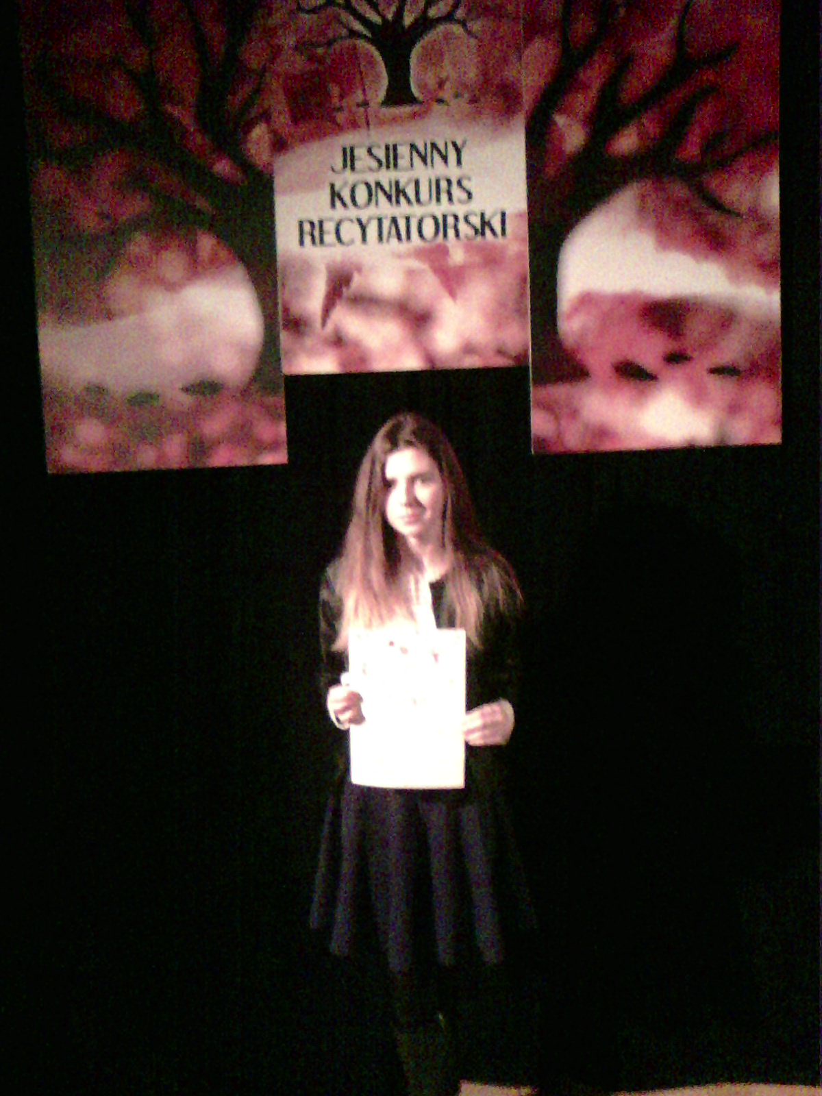 28 listopada 2017 r. mieliśmy satysfakcję brać udział w XXI Jesiennym Konkursie Recytatorskim, organizowanym przez Wojewódzki Ośrodek Kultury w Lublinie. Nasza uczennica Karolina Brzozowska z klasy VII (FINALISTKA ETAPU POWIATOWEGO) prezentowała na scenie wiersz „Widmo jesieni” Adama Asnyka: