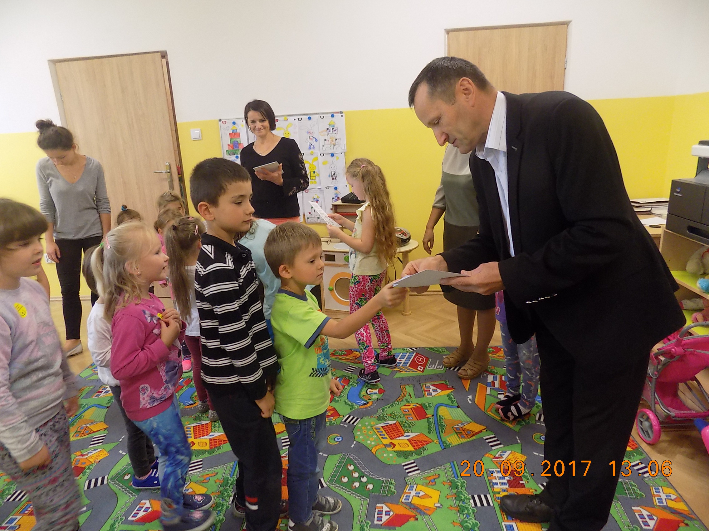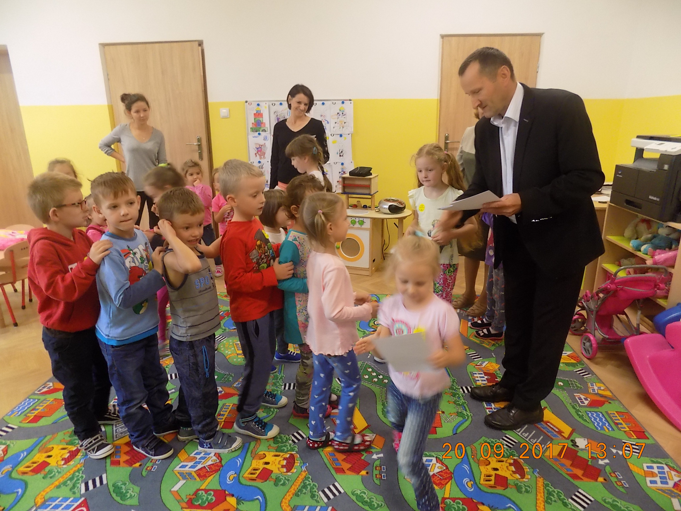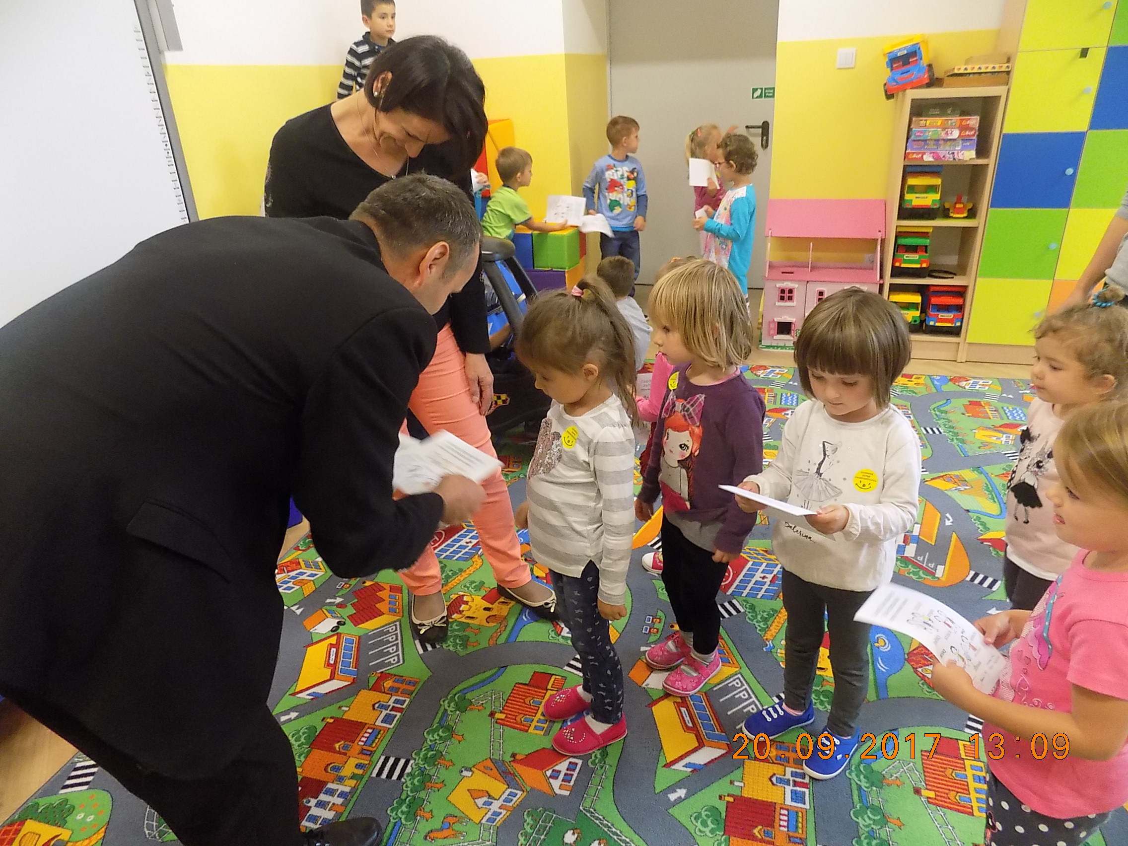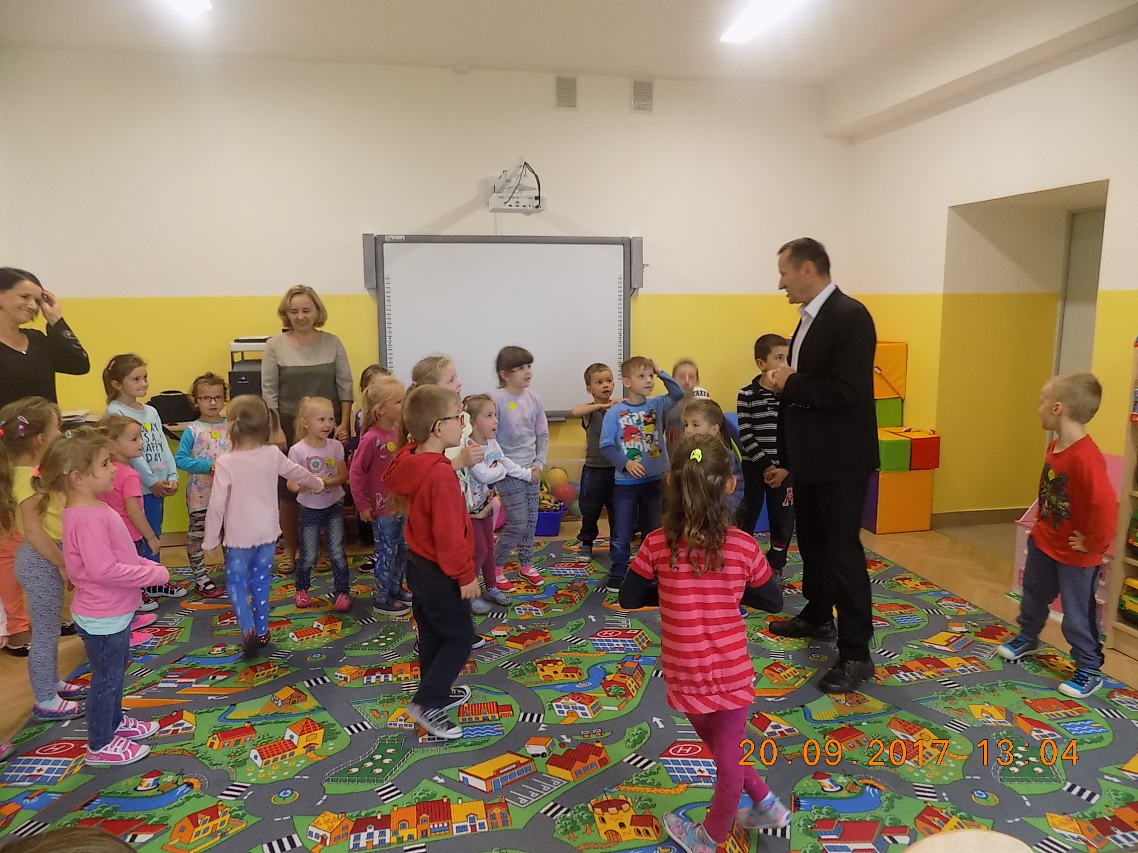 W związku z tym świętem dzieci ze starszej grupy (5 i 6 – letnie) odwiedziły dzieci młodsze w ich sali. Zaproszone zostały do wspólnych zabaw przy muzyce, podczas których miały okazję lepiej poznać się i zintegrować ze sobą. Przedszkolaków odwiedził w tym dniu również Pan Dyrektor Stanisław Saj, który złożył im życzenia i wręczył pamiątkowe dyplomiki. Każde dziecko otrzymało też odznakę ,,super przedszkolaka”.