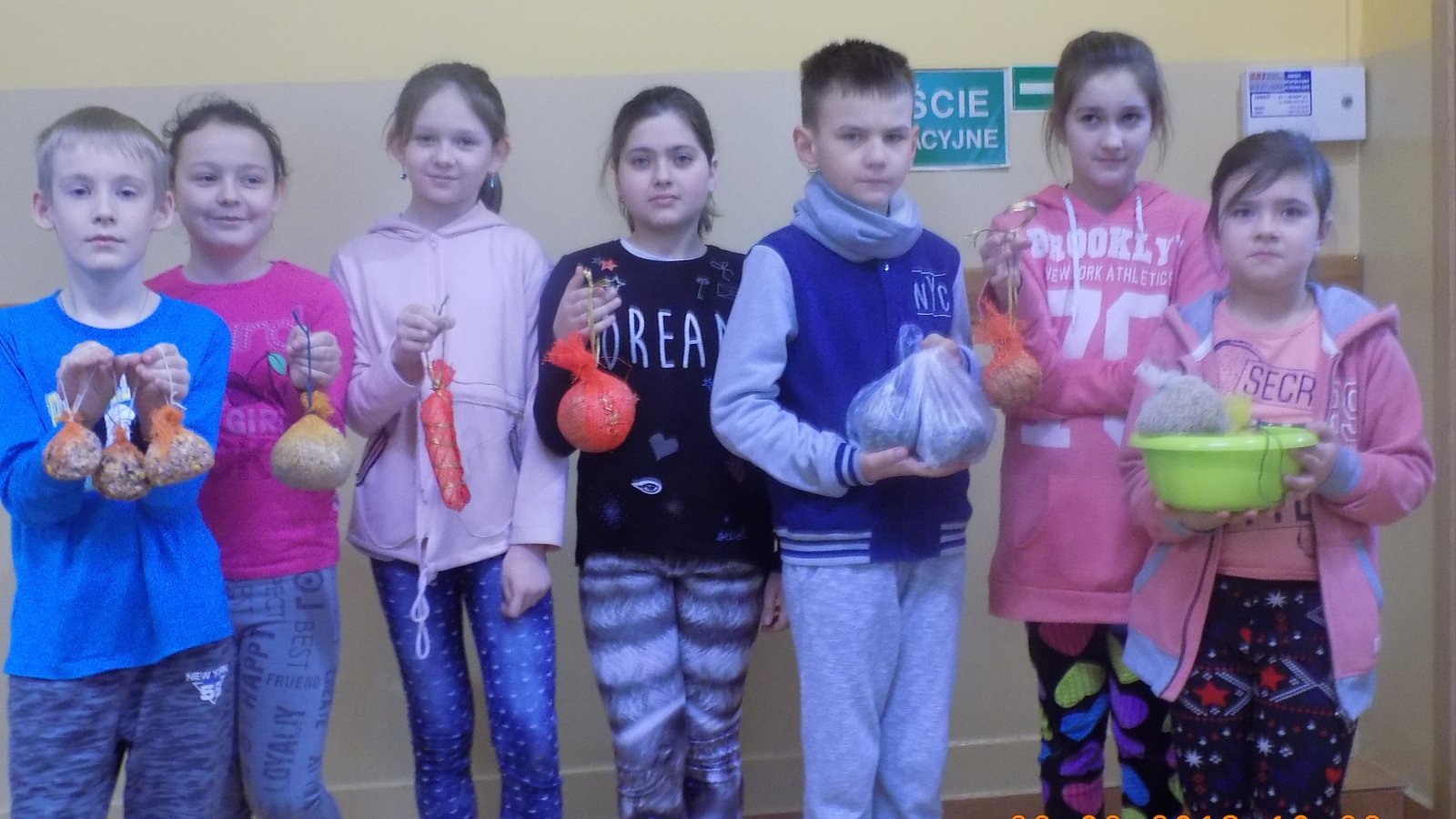 Tegoroczna zima - choć ogólnie niezbyt śnieżna i mroźna - coraz bardziej daje się we znaki zwierzętom. Wśród nich największej pomocy potrzebują ptaki. Z pomocą postanowili wyjść im uczniowie starszych klas naszej szkoły. Pod kierunkiem rodziców przygotowali w domu kule ze smalcu zawierające różnorodne nasiona, które następnie zostały zawieszane na gałęziach drzew i krzewów wokół szkoły.