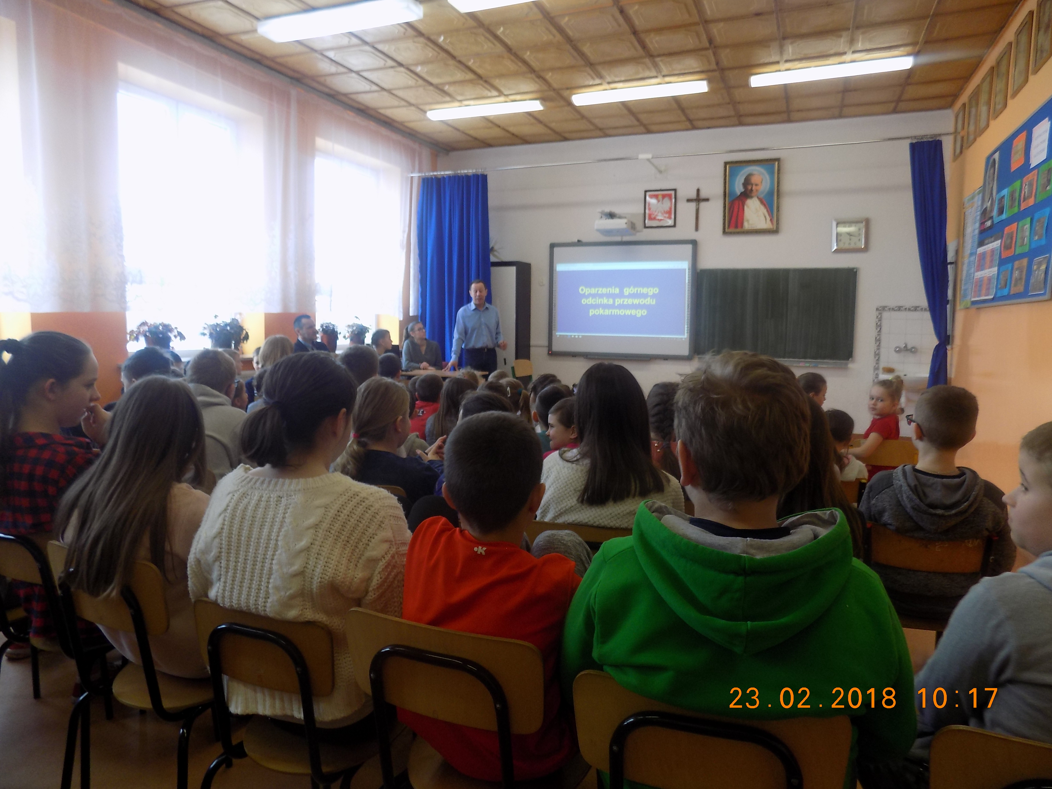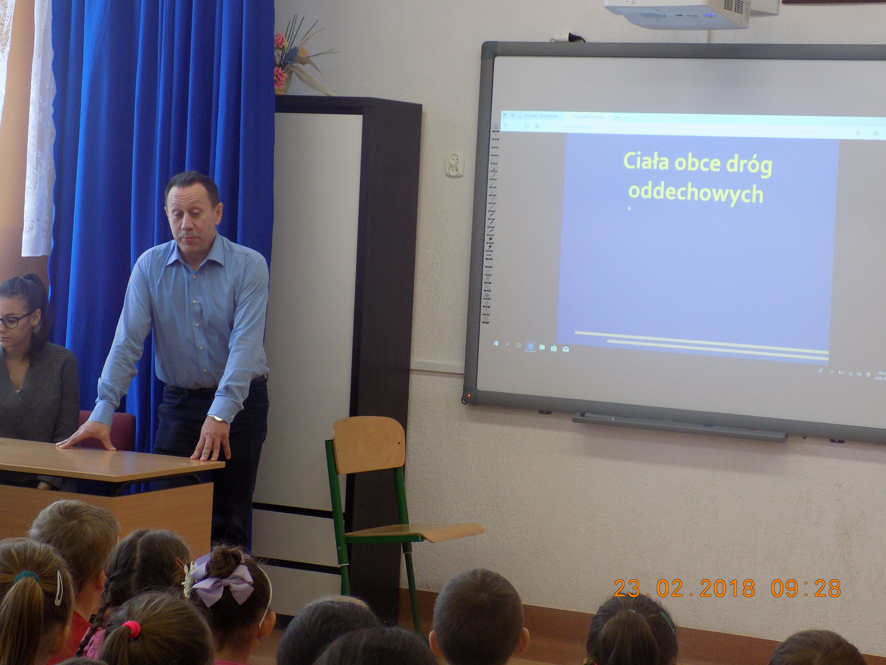 Laryngologia zajmuje się głównie diagnostyką, leczeniem i profilaktyką chorób: ucha, kości skroniowej, nosa, zatok przynosowych, jamy ustnej, gardła, krtani, tchawicy, oskrzeli, przełyku, głowy, szyi oraz przyległych do nich struktur, a także narządów zmysłów - słuchu, równowagi, węchu i smaku. Pan doktor opowiedział uczniom kilka anegdot związanych ze swoimi doświadczeniami zawodowymi i przedstawił podstawowe zasady udzielania pomocy przedmedycznej w przypadku utknięcia ciała obcego w poszczególnych odcinkach układu oddechowego. Wszyscy zebrani z uwagą słuchali prezentacji przygotowanej przez pana doktora Grzywnę, więc jego słowa na pewno zostaną zapamiętane na długo. Serdecznie dziękujemy panu doktorowi za wizytę oraz cenne wskazówki i rady udzielone naszym uczniom.