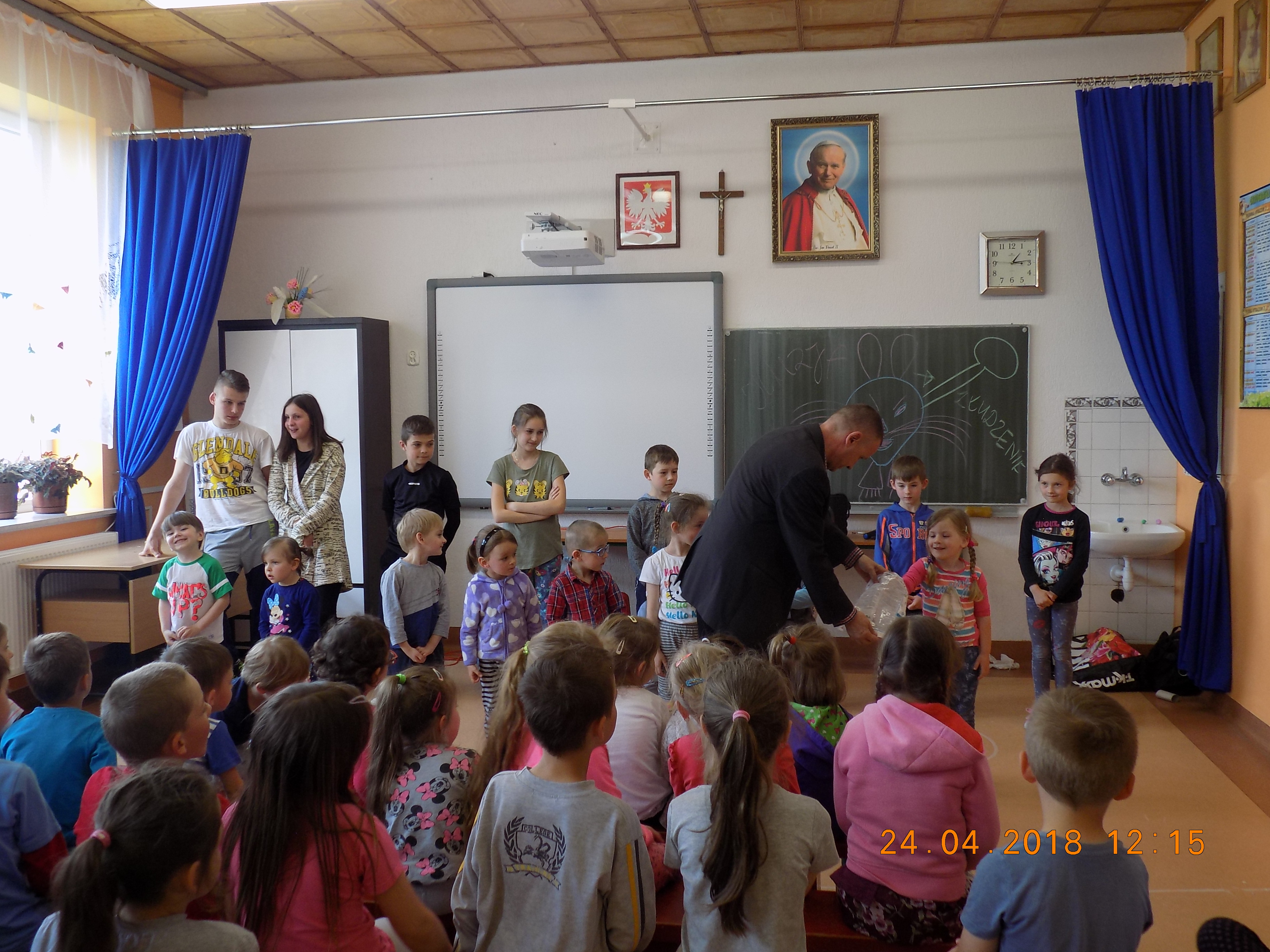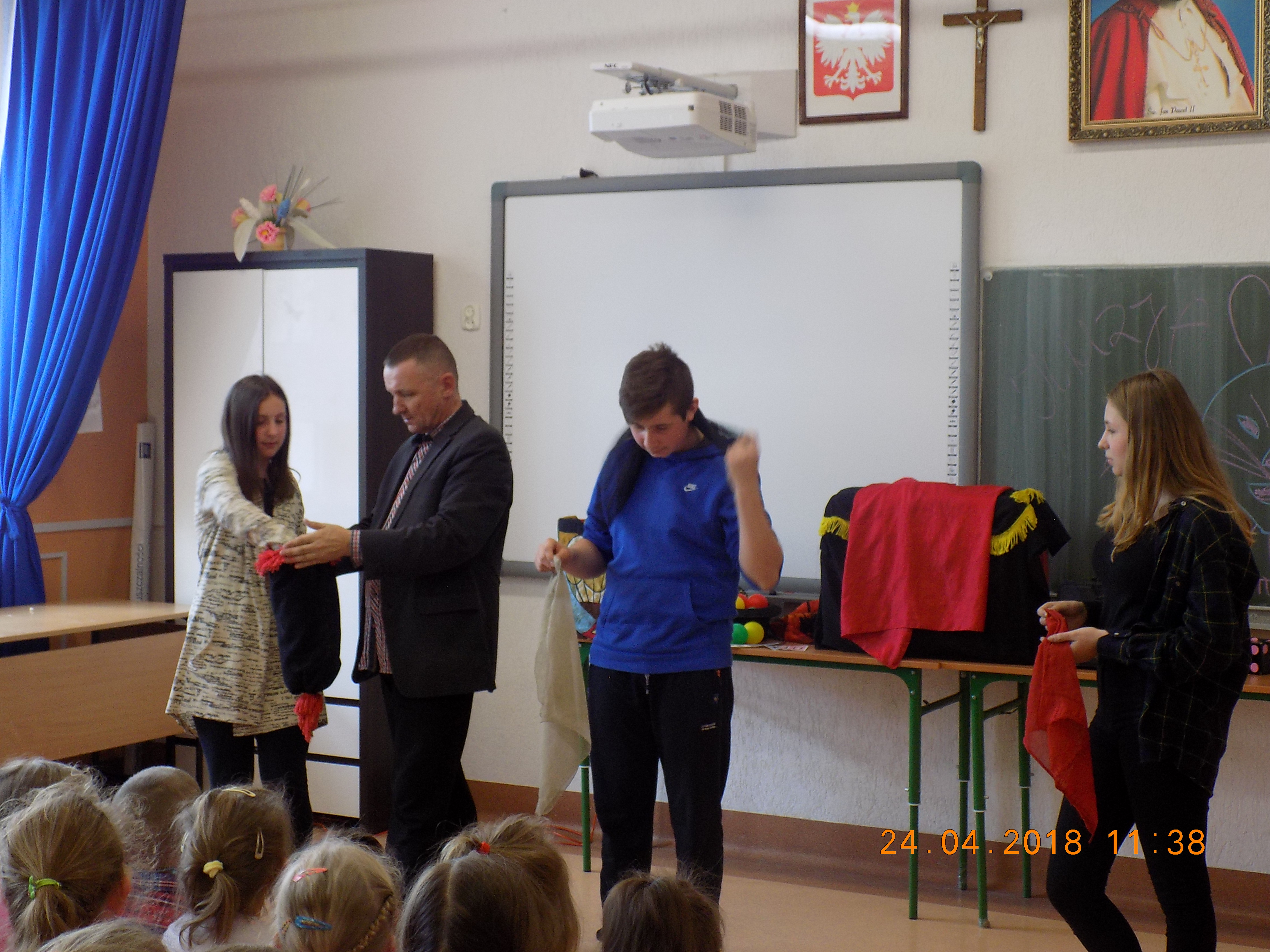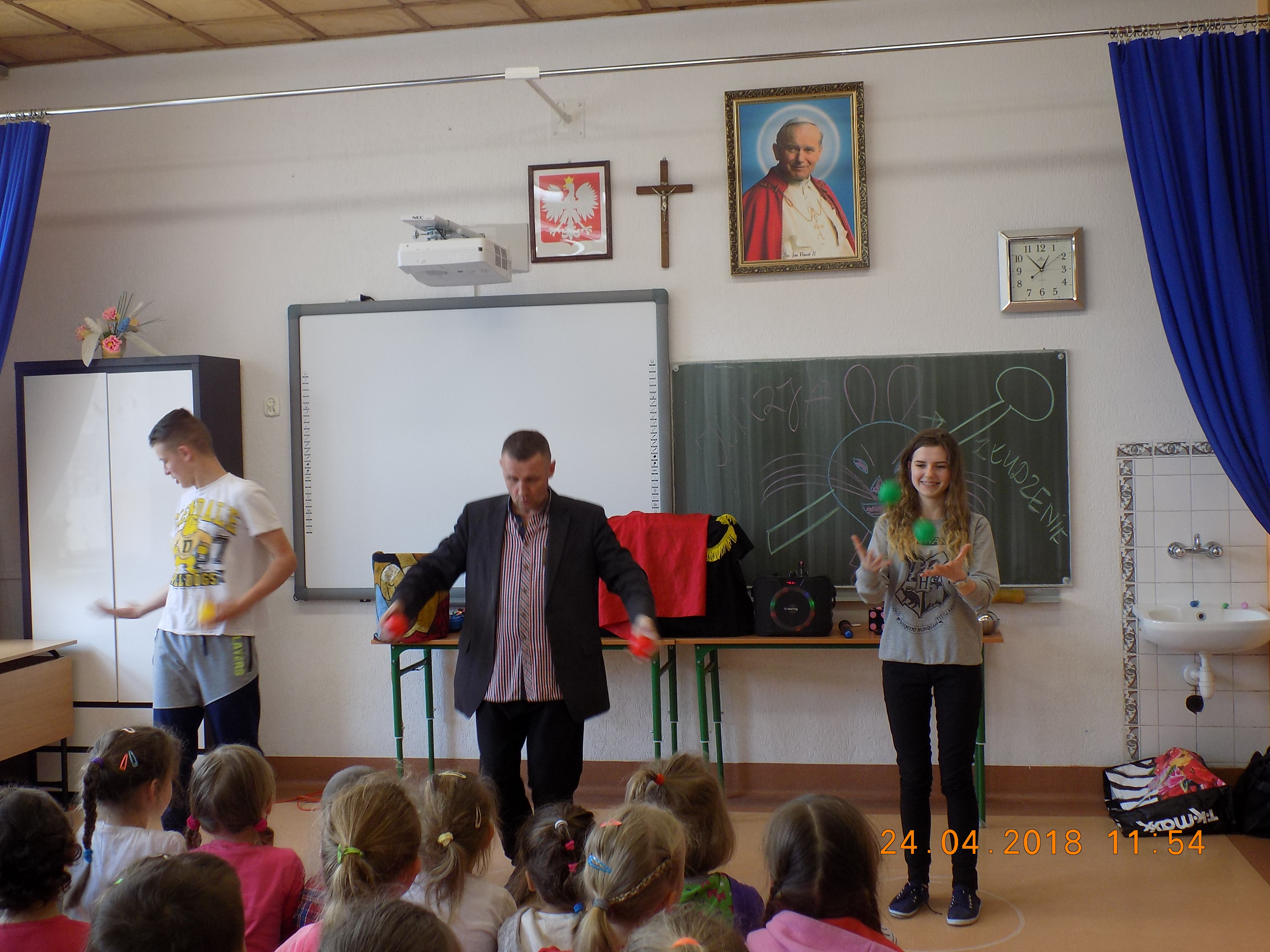 24 kwietnia mieliśmy okazję obejrzeć w szkole zabawne show w wykonaniu iluzjonisty. W programie znalazły się min.: sztuczki z kartami, sznurkami, znikającymi chustami i piłeczkami.