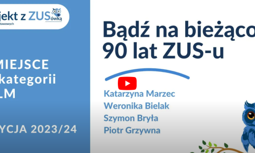 2024-05-27 Film naszych uczniów NAJLEPSZY W POLSCE! Jak informowaliśmy kilka dni temu, w ramach realizacji „Projektu z ZUS” nasi uczniowie wykonali prace uświadamiające, że ubezpieczenia społeczne są ważne. Już zwycięstwo filmu pt. „Bądź na bieżąco – 90 lat ZUS-u” autorstwa Katarzyny Marzec i Weroniki Bielak z klasy IV oraz Piotra Grzywny i Szymona Bryły z klasy VI w etapie wojewódzkim konkursu było dla nas wszystkich niezmiernie miłym zaskoczeniem i powodem do ogromnej dumy. Okazało się jednak, że to nie koniec dobrych wieści! Dziś został rozstrzygnięty etap centralny konkursu. Jak czytajmy na stronie internetowej organizatorów: „W tegorocznej odsłonie konkursu „Projekt z ZUS” na najlepszą pracę wyjaśniającą, dlaczego ubezpieczenia społeczne są ważne, walczyło kilkuset uczniów szkół podstawowych z całej Polski. Do finału zakwalifikowało się 40 prac. (…) Uczniowie znakomicie wywiązali się z zadania konkursowego. Prace, które wykonali, są pod każdym względem wyjątkowe. Pokazują, że młodzież doskonale rozumie, czemu służą ubezpieczenia społeczne”. Po przeanalizowaniu najlepszych prac, jury powołane przez pana Zbigniewa Derdziuka – prezesa Zakładu Ubezpieczeń Społecznych, postanowiło przyznać naszym uczniom I miejsce! To wielkie osiągnięcie i to – co należy podkreślić – o zasięgu ogólnopolskim! Ogromnie cieszy nas ten sukces. Gratulujemy Kasi, Weronice, Piotrkowi i Szymonowi! Dziękujemy za Waszą determinację, pracowitość, pomysłowość. Wszystkich zachęcamy do obejrzenia kilku zdjęć z planu filmowego. Przesyłamy również link do obejrzenia filmu. https://www.youtube.com/watch?v=XpMtJrJwwL4&t czytaj dalej »