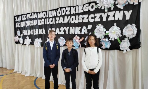 2024-04-25 Dzieci Zamojszczyzny. Zbrodnia, o której nie wolno zapomnieć. „Za wojnę są odpowiedzialni nie tylko ci, którzy ją bezpośrednio wywołują, ale również ci, którzy nie czynią wszystkiego, co leży w ich mocy aby jej przeszkodzić” Jan Paweł II To była już XIII edycja wojewódzkiego Konkursu Historycznego. „Dzieci Zamojszczyzny”. W tym roku nosząca podtytuł „Harcerka Grażynka” w 100. rocznicę urodzin harcerki Grażynki Kierszniewskiej, zamordowanej w wieku 16 lat przez hitlerowskich Niemców w rotundzie Zamojskiej w 1940 roku. Konkurs organizowany jest przez szkołę Podstawową nr 7 w Zamościu pod honorowym patronatem Lubelskiego Kuratora Oświaty, Prezydenta Miasta Zamość oraz Instytutu Pamięci Narodowej Oddział w Lublinie. Celem konkursu jest pogłębianie wiedzy i kształtowanie zainteresowań historią regionu, a także kształtowanie patriotyzmu w nawiązaniu do tragicznych losów narodu polskiego w czasie II wojny światowej. Konkurs był przeprowadzany w dwóch kategoriach – jako test wiedzy oraz praca plastyczna. Uczniowie naszej szkoły w tym trudnym konkursie brali udział po raz pierwszy. Trud przygotowań konkursowych podjęli Maja Moskwa z klasy V oraz Piotr Grzywna i Szymon Bryła z klasy VI. Po etapie szkolnym, który odbył się 10 kwietnia, wzięli udział w etapie finałowym. Nie zdołali zająć miejsc finałowych, ale wiedza i doświadczenie, które zdobyli z pewnością zaowocuje w przyszłości. Gratulacje. czytaj dalej »