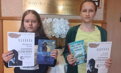 2024-05-17 Biografia Czesława Miłosza nie jest im obca! Z przyjemnością informujemy, że dwie uczennice klasy VII (Magdalena Kozak i Kamila Kamińska) znalazły się w gronie laureatów konkursu wiedzy o życiu i twórczości Czesława Miłosza zorganizowanego przez Miejską i Powiatową Bibliotekę Publiczną w Biłgoraju. Wydarzenie odbyło się w ramach XXI Tygodnia Bibliotek, a także z okazji ogłoszonego przez Senat RP Roku 2024 - Rokiem Czesława Miłosza. Uczestnicy konkursu musieli wykazać się znajomością życiorysu oraz najważniejszych dzieł wspomnianego wyżej znakomitego polskiego pisarza uhonorowanego wieloma znaczącymi odznaczeniami, m.in. Nagrodą Nobla. Gratulujemy dziewczynom osiągniętych sukcesów. Cieszymy się, że współczesna młodzież chce zdobywać i poszerzać swą wiedzę o wybitnych twórcach literatury. czytaj dalej »