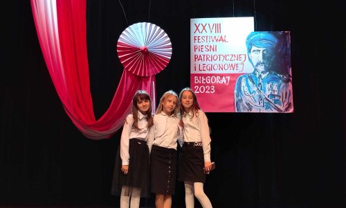 2023-11-09 Śpiewamy o Ojczyźnie - występ naszych uczennic na Festiwalu Pieśni Patriotycznej i Legionowej w Biłgoraju 9 listopada w na scenie Biłgorajskiego Centrum Kultury w Biłgoraju odbył się XXVIII Festiwal Pieśni Patriotycznej i Legionowej organizowany przez Młodzieżowy Dom Kultury w Biłgoraju. Wzięły w nim udział trzy uczennice naszej szkoły: Katarzyna Marzec (kl. IV), Weronika Bielak (kl. IV) oraz Lena Leśniewska (kl.V). Wydarzenie miało na celu propagowanie patriotyzmu wśród dzieci i młodzieży, a także umożliwienie rozwijania talentów wokalnych. Dziękujemy dziewczętom za godne reprezentowanie naszej szkoły! czytaj dalej »