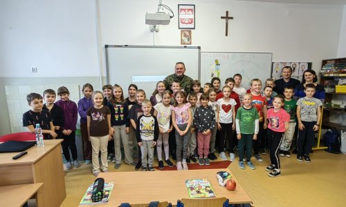 2025-11-27 „Edukacja z wojskiem” - wykład ppor. dr Sławomira Franca z WOT 25 listopada 2025 r. odbył się wykład dla uczniów klas I–IV, który poprowadził ppor. dr Sławomir Franc, żołnierz Wojsk Obrony Terytorialnej. Spotkanie zostało zorganizowane w ramach programu „Edukacja z wojskiem”, mającego na celu wzmacnianie świadomości i bezpieczeństwa wśród najmłodszych.