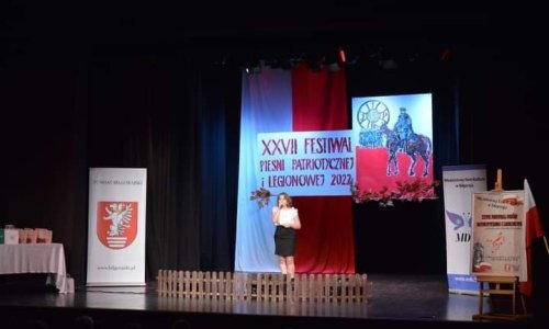 2022-11-09 Nasza uczennica laureatką powiatowego festiwalu! Młodzieżowy Dom Kultury w Biłgoraju już po raz dwudziesty siódmy zorganizował Powiatowy Festiwal Pieśni Patriotycznej i Legionowej. W tym roku odbył się on 4 listopada na scenie Biłgorajskiego Centrum Kultury. Przedsięwzięcie miało na celu przede wszystkim propagowanie patriotyzmu wśród dzieci i młodzieży oraz rozwijanie wrażliwości inspirowanej kulturą czy sztuką.