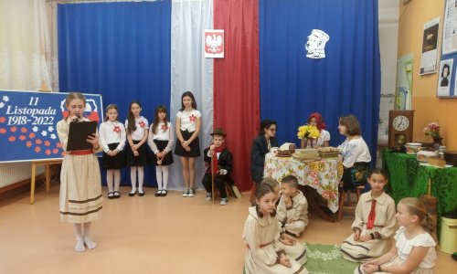 By upamiętnić 104. rocznicę odzyskania przez Polskę niepodległości, nasi uczniowie wystawili w szkole spektakl pt. „Pisk białego orła” autorstwa Adama Szafrańca, który w następujący sposób streszcza tematykę inscenizacji: „Fabuła przedstawienia została osnuta wokół historii wiejskiej rodziny, mocno naznaczonej patriotyzmem, która w czasie I Wojny Światowej przeżywa wojenną traumę - wymarsz ojca i jednego z synów na front. Ludzie ci ukrywają w swoim domu poetę, który odwołując się często do literatury i poezji okresu zaborów, podtrzymuje i umacnia głęboki patriotyzm domowników. Symbolem wolnej Polski staje się biały orzeł, którego głos - pisk, słyszalny w duszy Polaków, nie pozwala tracić nadziei na wolność”. Seans wzbogacały nastrojowe piosenki, a także ilustracja muzycznej Legendy o Białym Orle.