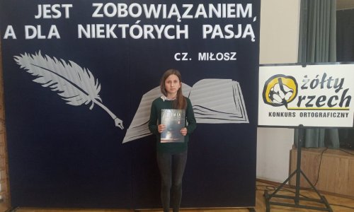 Młodzież naszej szkoły chętnie wzięła udział w tegorocznej edycji konkursu składającego się z dwóch etapów. Pierwszym były eliminacje szkolne. Zgłosiło się do nich dziewięć osób. Najmniej błędów w dyktandzie popełniła Natalia Deruś z klasy VII, która zakwalifikowała się do finału powiatowego. Odbył się on 8 kwietnia 2022 roku w RCEZ w Biłgoraju.
