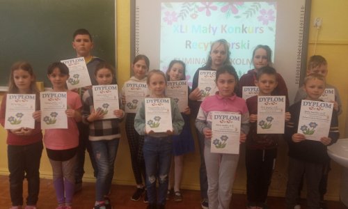 2022-04-20 Szkolne eliminacje do Małego Konkursu Recytatorskiego 20 kwietnia w naszej szkole odbyły się eliminacje do Małego Konkursu Recytatorskiego organizowanego przez Wojewódzki Ośrodek Kultury w Lublinie. W zmaganiach wzięło udział czternastu uczniów z klas II-VII. Wszyscy pięknie zaprezentowali przygotowane wiersze oraz fragmenty prozy. Komisja konkursowa nie miała łatwego zadania, by wyłonić zwycięzców, tym bardziej, że do kolejnego etapu można było zakwalifikować jedynie pięć osób. Ostatecznie laureatami zostali:
