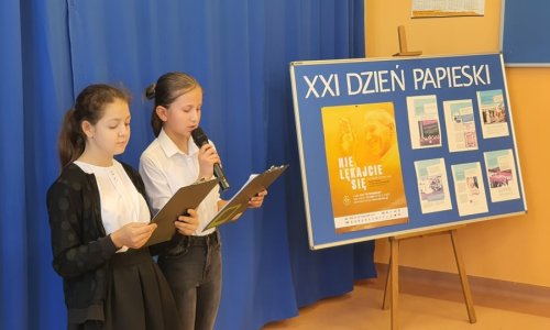 2021-10-14 XXI Dzień Papieski 8 października w naszej szkole odbyła się uroczysta akademia z okazji obchodzonego już po raz XXI „Dnia Papieskiego." Podczas tegorocznych obchodów jako hasło przewodnie zostały wybrane słowa Jana Pawła II „Nie lękajcie się." Były to jedne z pierwszych słów, jakie Papież Polak skierował do wiernych podczas homilii wygłoszonej 22 października 1978 roku w czasie Mszy św. Inaugurującej pontyfikat. Prowadzące uświadomiły nam, że każdy z nas ma swoją osobistą drogę do Pana Boga, a na tej drodze mamy do pokonania różnego rodzaju lęki, które wyzwalają w nas postawę zaufania na wzór świętego Jana Pawła II, który nie tylko przed laty, ale także dzisiaj zachęca nas słowami „Nie bójcie się!!! Otwórzcie drzwi Chrystusowi." Obchodom „Dnia Papieskiego” w naszej szkole towarzyszyła przeprowadzona już po raz kolejny zbiórka środków na stypendia dla młodych, zdolnych osób pochodzących z małych miejscowości. W tym roku konto fundacji „Dzieło Nowego Tysiąclecia” wsparliśmy kwotą 260 zł. czytaj dalej »