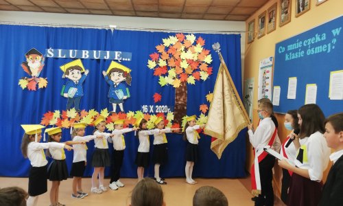 2020-10-19 Ślubowanie uczniów klasy I 16 października odbyło się ślubowanie uczniów klasy pierwszej. Ślubowanie i pasowanie na uczniów to bardzo ważne wydarzenie. Przygotowania trwały od początku roku szkolnego. Uczniowie wdrażali się do pełnienia różnych obowiązków wynikających z faktu rozpoczęcie nauki w szkole. Dzielnie uczyli się wierszy, piosenek. W dniu ślubowania, odświętnie ubrani i bardzo przejęci zaprezentowali swoje umiejętności, przeszli test sprawności, odpowiedzieli na szereg bardzo ważnych pytań i wypili z uśmiechem przygotowany przez rodziców napój mądrości i odwagi. Zaproszeni goście zgodnie potwierdzili, iż wszystkie dzieci wspaniale zdały „egzamin pierwszoklasisty”. Doniosłym momentem było ślubowanie pierwszoklasistów przed sztandarem naszej szkoły. Uczniowie ślubowali uczyć się pilnie, być dobrym kolegą, przyjacielem zwierząt i roślin oraz godnie reprezentować naszą szkołę. Po złożeniu ślubowania pan dyrektor Stanisław Saj dokonał symbolicznego pasowania na ucznia. Na pamiątkę tego wydarzenia pierwszoklasiści otrzymali dyplomy, drobne upominki i kuferki pełne słodyczy. Uroczystość zakończyła się poczęstunkiem przygotowanym przez rodziców. Ten dzień na długo zostanie pierwszakom w pamięci. czytaj dalej »