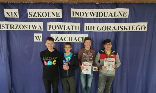 2020-02-20 Dublet na zawodach szachowych Dwa pierwsze miejsca w swojej kategorii wiekowej zajęli uczniowie naszej szkoły w XIX SZKOLNYCH INDYWIDUALNYCH MISTRZOSTWACH POWIATU BIŁGORAJSKIEGO W SZACHACH. Dnia 18 lutego w GOSiR w Biszczy odbyły się kolejne mistrzostwa powiatowe w indywidualnych szachach. W zawodach udział wzięło ponad 100 uczniów ze szkół podstawowych i ponadpodstawowych naszego powiatu Naszą szkołę reprezentowało czterech chłopaków: Czajka Rafał, Kozak Jakub, Liwak Bartosz, Dubaj Kacper. Po grach systemem szwajcarskim na dystansie 7 rund, gdzie gra toczyła się losowo (każdy zawodnik z każdej grupy wiekowej mógł stoczyć pojedynek) wyłoniono zwycięzców poszczególnych kategorii. Pierwsze miejsce w Igrzyskach Młodzieży Szkolnej wywalczył Jakub Kozak zdobywając 5 pkt., drugi był Rafał Czajka - zdobywca 4,5 pkt. Na kolejnych pozycjach uplasował się Bartosz Liwak - 6 miejsce, któremu zabrakło remisu w jednym meczu do 3 miejsca. Kacper Dubaj ostatecznie zakończył zmagania na 11 miejscu. Serdecznie gratulujemy. czytaj dalej »