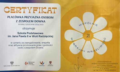 Z radością ogłaszamy, że za udział w tym wyjątkowym przedsięwzięciu nasza szkoła otrzymała prestiżowy certyfikat „Placówki przyjaznej osobom z zespołem Downa”. To dla nas wielkie wyróżnienie! czytaj dalej » -