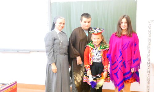 2018-10-27 Spotkanie z Siostrą Misjonarką 25 października naszą szkołę odwiedziła siostra Urszula Myszak Misjonarka ze Zgromadzenia Sióstr Świętej Rodziny z Bordeaux. W bardzo ciekawy sposób opowiadała o swojej pracy misyjnej w Peru w osadzie Jimbe. Podczas spotkania mogliśmy dowiedzieć się jak wygląda codzienne życie mieszkańców tej osady, gdzie warunki są bardzo trudne ze względu na zimny klimat górski i ciężką pracę przy uprawie roli, Domy, w których mieszkają są zbudowane z gliny, bez umeblowania a za łóżko służy podłoga. Dzieci do szkoły idą od jednej do trzech godzin pieszo, dlatego są często zmęczone i niedożywione, a przez to mają słabe osiągnięcia w nauce. Mogliśmy także posłuchać tradycyjnej muzyki peruwiańskiej, nauczyć się kilku hiszpańskich słów, przymierzyć piękne, kolorowe stroje mieszkańców tego kraju, a nawet zaśpiewać piosenkę w języku hiszpańskim. Na zakończenie naszej katechezy misyjnej odmówiliśmy modlitwę Zdrowaś Maryjo w języku polskim i hiszpańskim.
